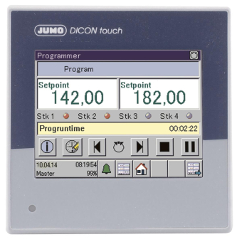 Der zweikanalige, universelle Prozess- und Programmregler, wird über ein brillantes Display visualisiert und per Touchscreen intuitiv bedient. Die beiden Regelkanäle verfügen über den bewährten Regelalgorithmus mit zwei möglichen Optimierungsvarianten. Diese ermöglichen eine einfache und hochgenaue Inbetriebnahme. Auch eine Mehrzonenregelung, Kaskadenregelung oder sonstige komplexe Regelaufgaben sind damit möglich. Im nachstehenden Blockschaltbild werden die vielfältigen Hardwaremöglichkeiten des modular aufgebauten Hardwarekonzeptes dargestellt. 2 analoge Universaleingänge und 7 Binäreingänge können unterschiedliche physikalische Messwerte mit hoher Präzision erfassen. Die Ansteuerung der Aktoren kann durch unterschiedliche Ausgangsvarianten analog oder digital direkt im Gerät erfolgen. Durch externe Digitalausgänge können diese noch erweitert werden. Weiterhin verfügt der Regler mit Touchscreen über 2 Relaisausgänge (Wechsler). Zur Kommunikation mit übergeordneten Systemen können Schnittstellen wie Modbus (Master/Slave), PROFIBUS (optional!) oder Ethernet mit Webserver (optional!) genutzt werden. Für eine sichere Prozessbedienung verfügt das Gerät über eine passwortgeschützte Benutzerverwaltung mit einer individuellen Rechtevergabe für unterschiedliche Ebenen oder Steuerbefehle. Bildschirmmasken für Regler, Programmgeber (Option!), Registrierung (Option!) und Übersichtsbilder stehen vorgefertigt zur Verfügung. Ein individuelles Prozessbild kann mit Hilfe der Konfigurationssoftware selbst erstellt werden. Über die Konfigurationssoftware lässt sich der Prozessregler einfach programmieren, mathematische oder logische Zusammenhänge beschreiben oder kundenspezifische Linearisierungen erstellen. Darüber hinaus sind Tools enthalten, um externe Signale oder die Regelstrecke zu simulieren oder für die Dauer der Inbetriebnahme aufzuzeichnen. Ein umfangreiches Alarm- und Grenzwertkonzept sowie eine flexible Digitalsignalverwaltung runden das all-in-one-Gerät ab.