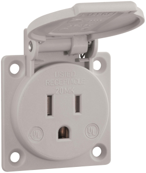 Die Einbausteckdose für USA nach UL 498/NEMA 5-15 R und für Kanada nach CSA C22.2 Nr.: 42 besteht aus hochschlagzähem Thermoplast. Die Einbausteckdose 1-polig + N + Erde ist mit einem Schraubanschluss, einer vierfach Flanschbefestigung und einem Klappdeckel ausgestattet. Die Einbausteckdose ist hitze-, kälte- sowie UV-beständig. Der Leitungsanschluss ist von hinten und der Öffnungswinkel ca.: 106°.