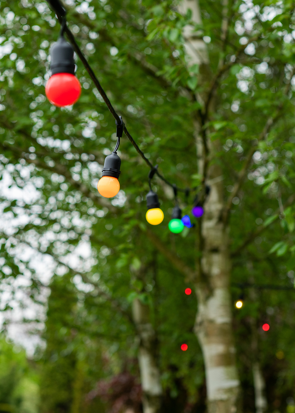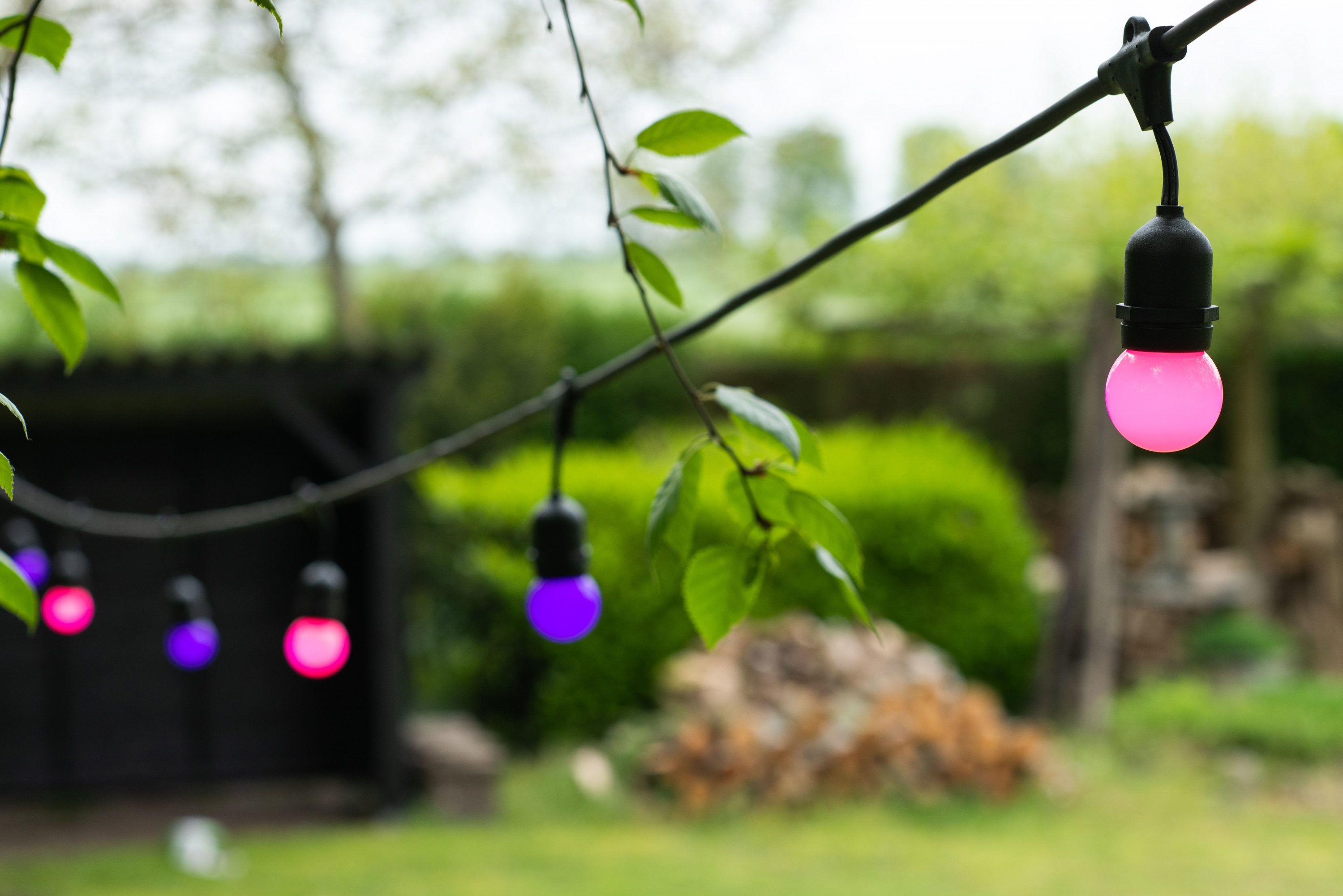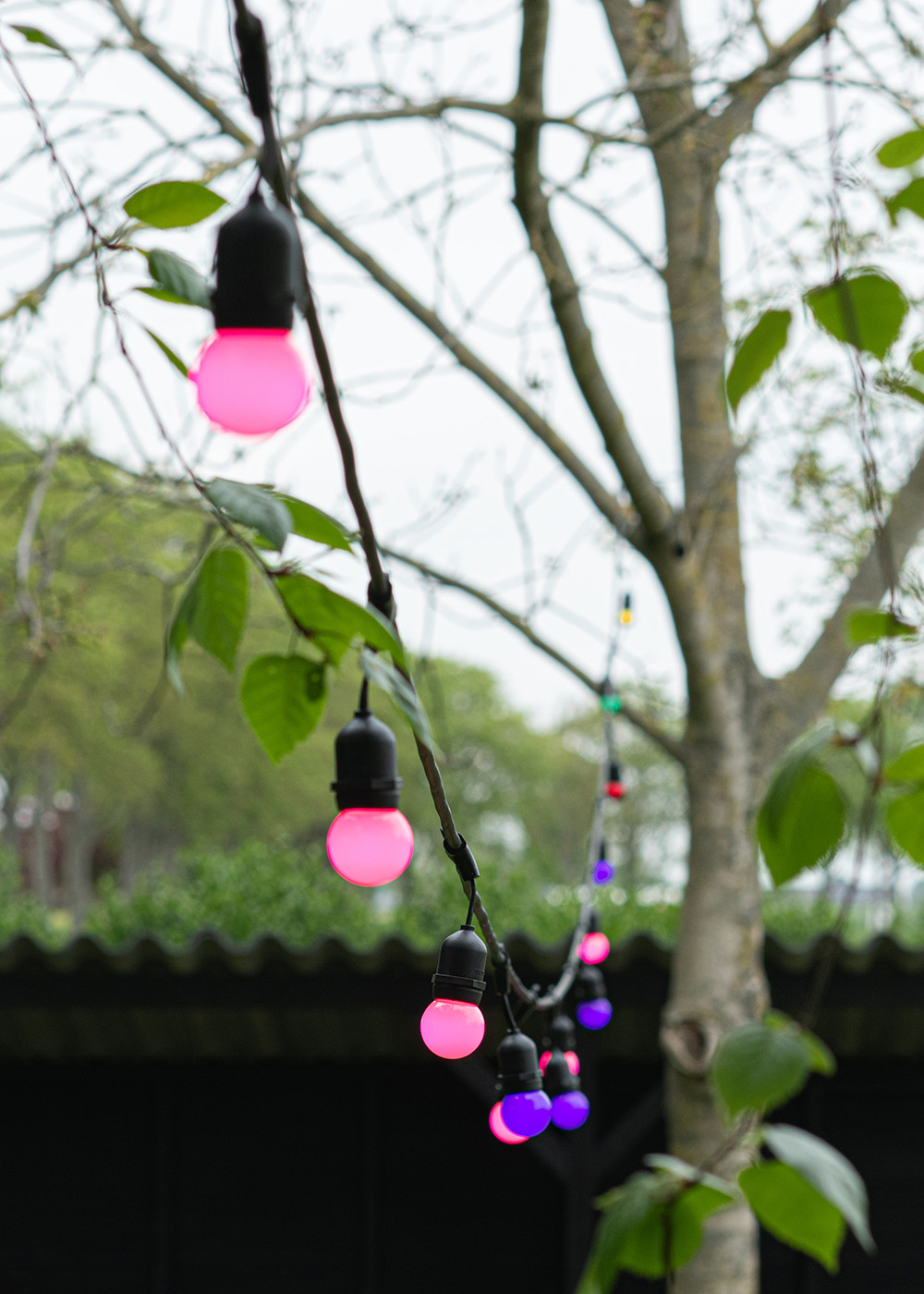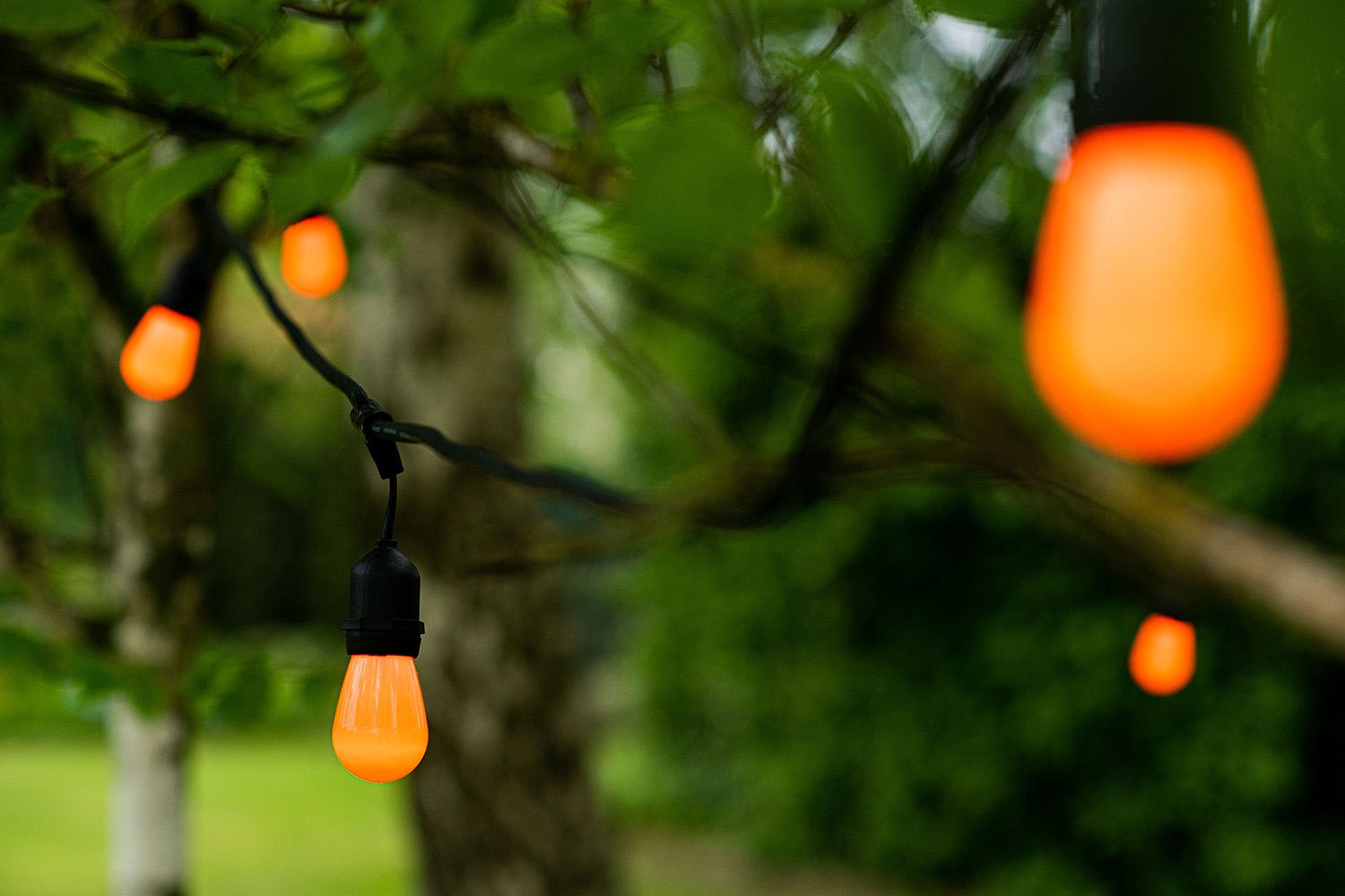 BAI Lichterkette Pendel 15m Schwarz mit 15 hängenden E27 Fassungen Max 25W pro Fassung IP44 CLII Kabel H07RN-F 2x1.5mm² mit Stecker Koppelbar. Fassungen und Lampen sollten nach unten zeigen