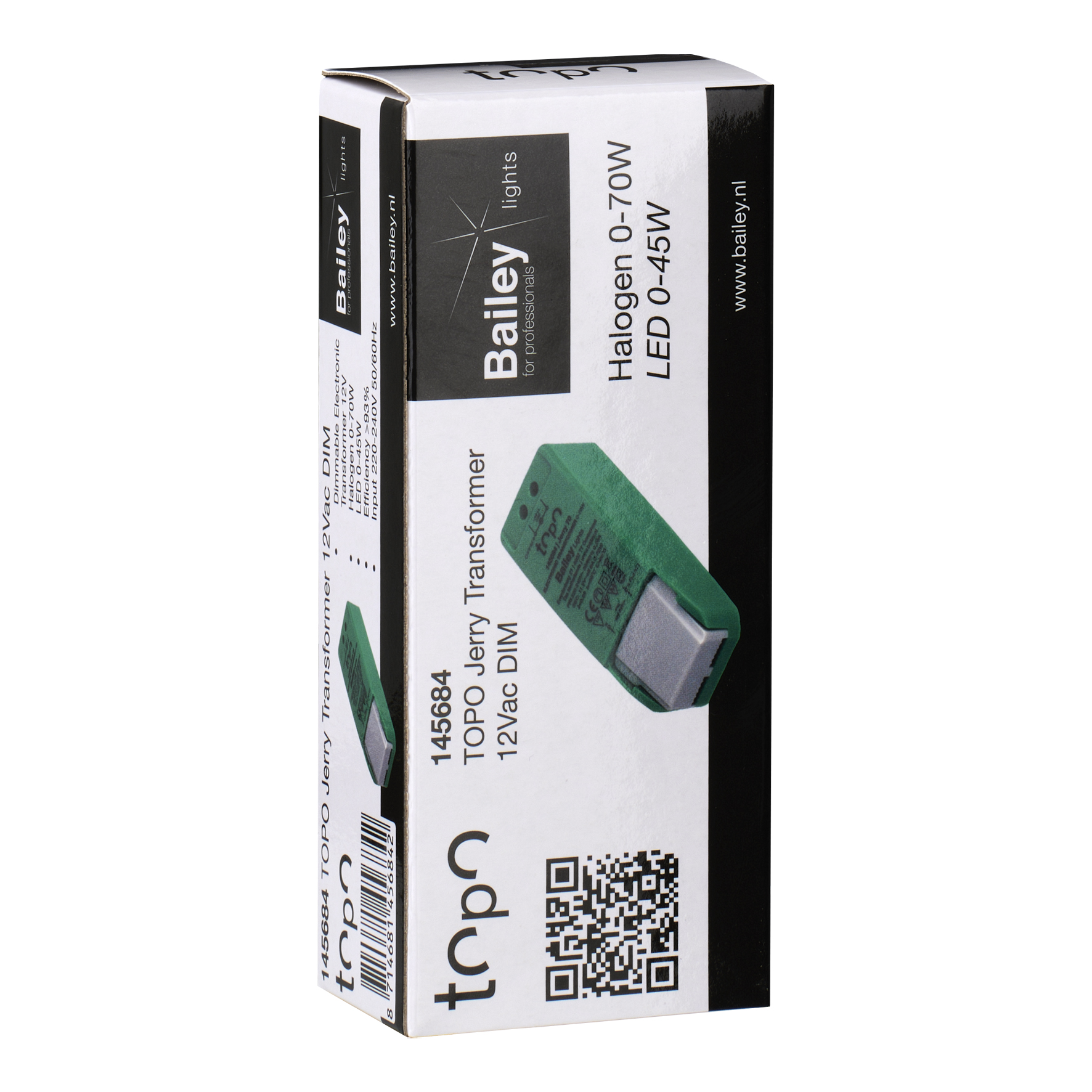 Mit der Bailey tOpO Trafo-Serie stellt Bailey eine Reihe elektronischer Trafos vor, die einen großen Marktbedarf in diesem Bereich abdecken. Topo ist italienisch für Maus und das ist ein perfekter Vergleich; Flexibel, klein in der Größe, aber groß in der Leistung. Der Bailey topO-Transformator passt sehr gut in kleine Räume wie z. B. eine abgehängte Decke. Dieser dimmbare Transformator beginnt bei 0W, was ideal für LED-Lampen ist, da keine Mindestlast erforderlich ist. Neben 12V LED Lampen ist dieser Trafo auch für 12V Halogenlampen geeignet. Dimmbar mit Phasenabschnitts- und Phasenanschnittdimmer. Für die Umrüstung auf LED muss man wie folgt rechnen: 105W (Typ Mighty) Halogen = 70W LED, 70W Halogen (Typ Jerry) = 45W LED, 50W Halogen (Typ Mini) = 30W LED. Um das Ganze noch attraktiver und erkennbarer zu machen, ist das Gehäuse im bekannten Bailey-Grün gehalten.