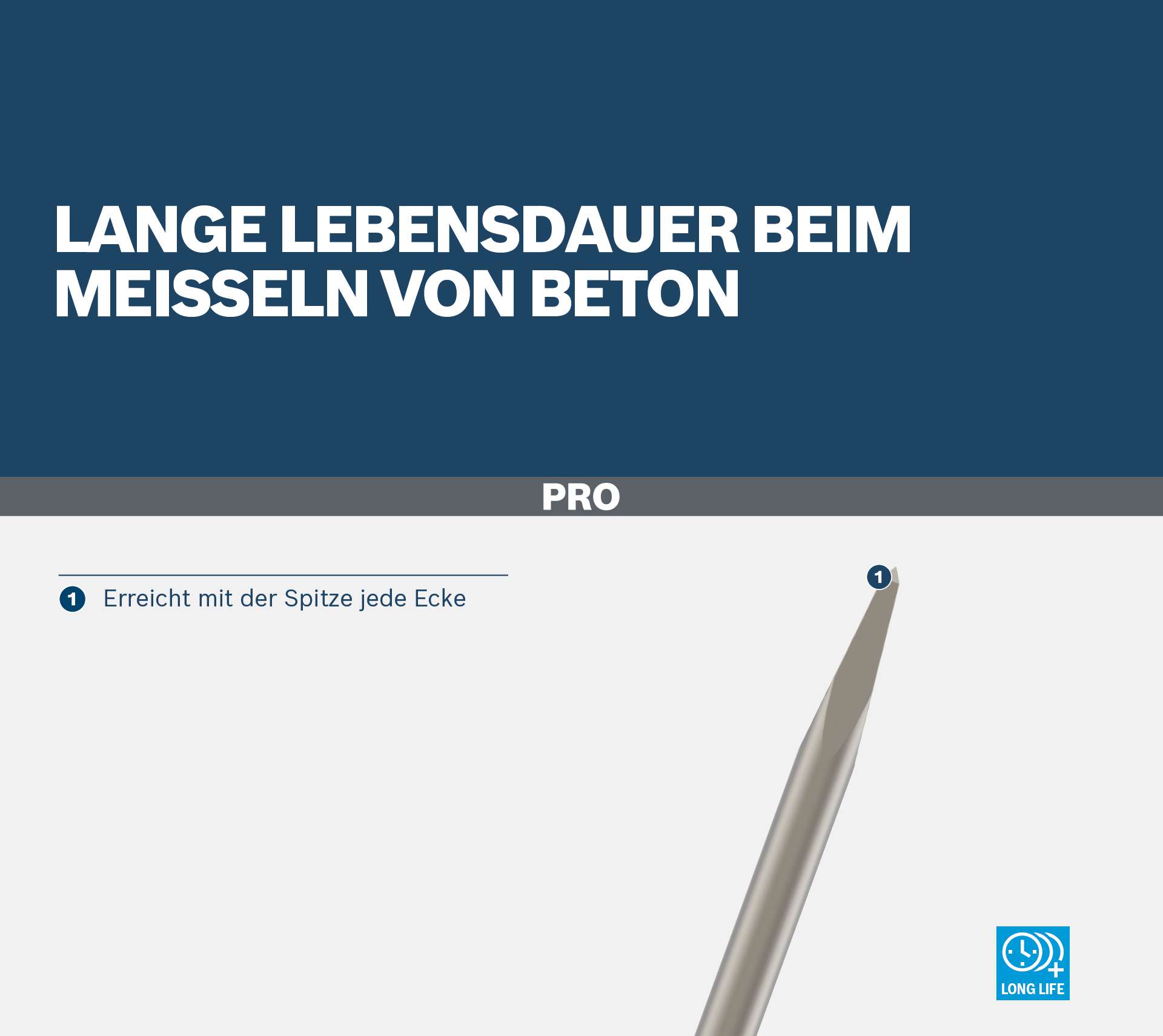 Lange Lebensdauer beim Meißeln von Beton! Erreicht mit der Spitze jede Ecke Du suchst einen langlebigen Meißel, um Beton und Ziegel mit deinem Bohrhammer aufzubrechen? Dann ist der PRO SDS max-4C Spitzmeißel die richtige Wahl. Wir haben ihn so konzipiert, dass du leichtere Präzisionsmeißelarbeiten effektiv und ohne Unterbrechungen erledigen kannst.
