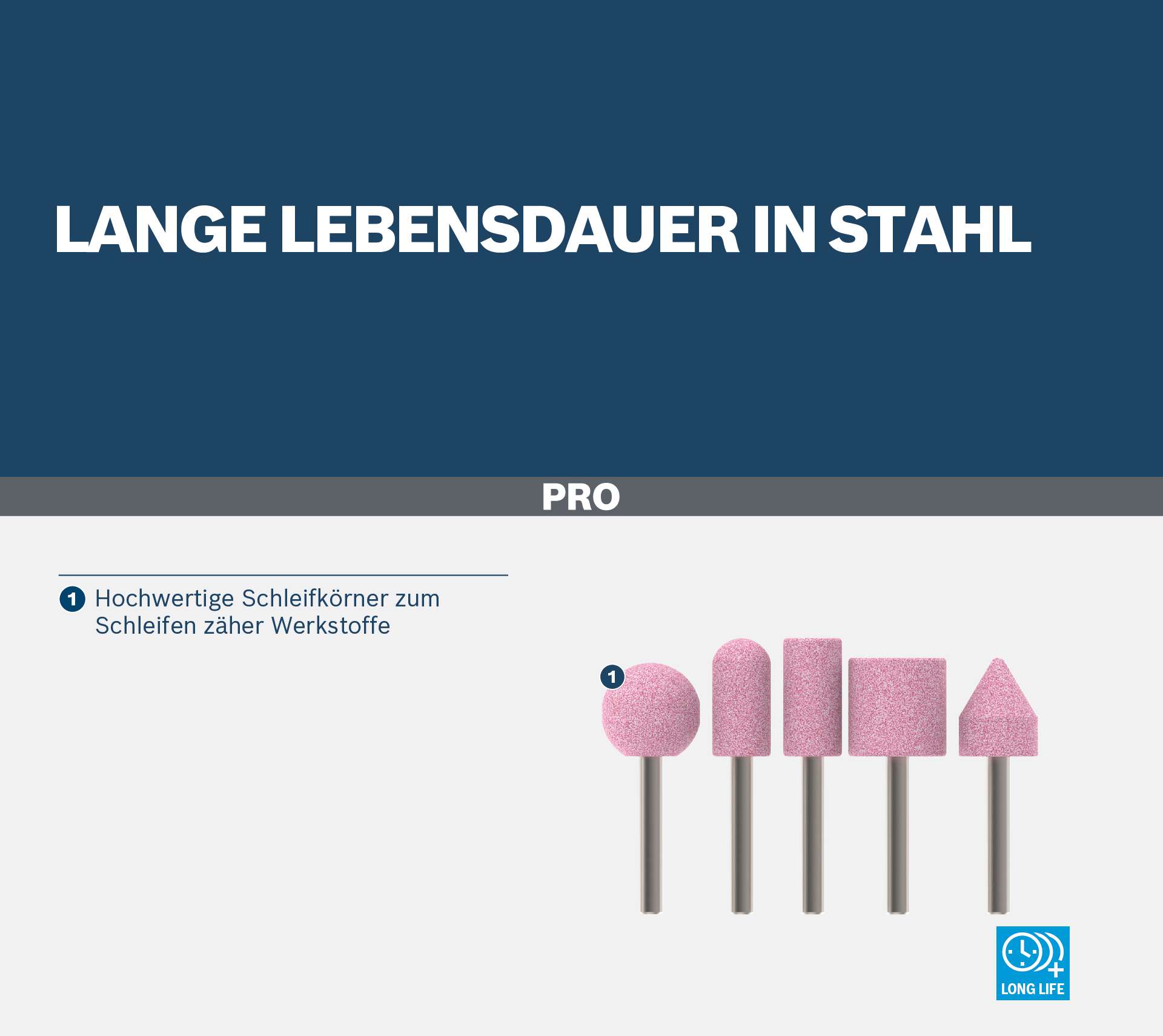 Lange Lebensdauer in Stahl! Hochwertige Schleifkörner zum Schleifen zäher Werkstoffe Aufgrund ihrer geringen Größe und unterschiedlichen Formen werden Schleifstifte dort eingesetzt, wo Schleifscheiben nicht hinkommen. PRO Steel Schleifstifte sind nützlich, wenn du kleine Teile schleifen und entgraten musst, die schwer zugänglich sind oder unregelmäßige Formen haben.