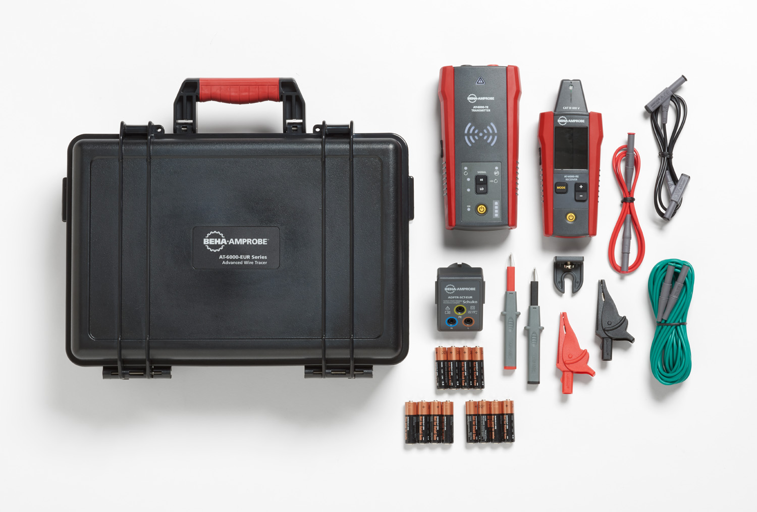 Der in zwei unterschiedlichen Kits (AT-6020-EUR und AT-6030-EUR) erhältliche Leitungssucher AT-6000-EUR besteht aus einem Empfänger und einem leistungsfähigen Sender zur Suche von spannungsführenden und spannungsfreien Adern, Leitungen, Leitungsschutzschaltern und Sicherungen. Egal ob Anfänger oder Experte; mit dem Leitungssucherset von Beha-Amprobe können Sie ihre Arbeitsaufgaben schnell erledigen. Beim Empfänger AT-6000-RE werden zur Erkennung von Signalen in Adern und Leitungen zwei Verfahren verwendet: aktive Leitungsverfolgung (mit dem Sender) und passive Leitungsverfolgung (ohne den Sender). An schlecht erreichbaren Stellen können mit dem Spitzensensor des Empfängers Adern in Ecken, an engen Stellen und in Abzweigdosen verfolgt werden. Der Modus Leitungsschutzschalter/Sicherungen suchen dient zur schnellen und einfachen Lokalisierung und Ermittlung des richtigen Leitungsschutzschalters bzw. der richtigen Sicherung. Der Sender AT-6000-TE Transmitter kann bei spannungsfreien und spannungsführenden Stromkreisen bis 600 V AC/DC in elektrischen Umgebungen der Messkategorien I bis III eingesetzt werden. Zur Auswahl stehen der Signalmodus Stark (HI), Schwach (LO) und Schleife. Die Funktion zur Zuordnung von Leitungsschutzschaltern/Sicherungen beseitigt die bei älteren Leitungssuchern häufig vorhandene Mehrdeutigkeit, da die Funktion den richtigen Leitungsschutzschalter bzw. die richtige Sicherung anhand des höchsten gemessenen Signals erkennt.
