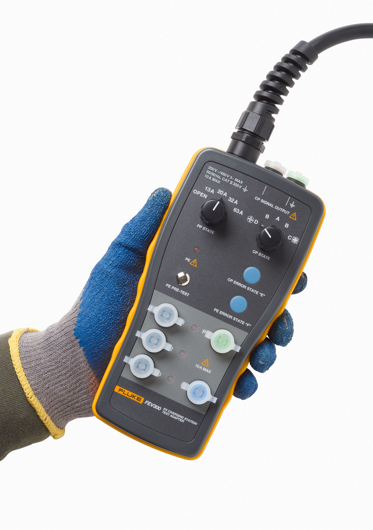 Der FLK-FEV300/BASIC von Fluke ist ein eigenständiger Adapter für Ladestationen für Elektrofahrzeuge, AC-Modus 3. Er kann als separate Einheit für die Verwendung mit einem Steckverbinder TY2 oder TY1 für Ladekabel des Typs 1 oder 2 bestellt werden.