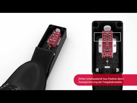 Geeignet für hohe Anforderungen in industriellen Einsatzbereichen. Vorhandene Befestigungslöcher bieten die Möglichkeit, die Fußschalter auf dem Untergrund zu verschrauben. Jeder Fußschalter ist mit vier Gummifüßen gegen Verrutschen ausgerüstet. Der Fußhebel ist aus Thermoplast gefertigt. Der Zustimmfußschalter bietet zwei Zustimmkontakte und einen Meldekontakt und ist sowohl mit als auch ohne Rastung erhältlich. Wird das Pedal bis auf den Druckpunkt betätigt, schließen die beiden Freigabekontakte. Wird das Pedal losgelassen, öffnen die Freigabekontakte wieder. Wird das Pedal durchgetreten, also über den Druckpunkt hinaus, so öffnen die Freigabekontakte zwangstrennend. Für die Anwendung einer Zustimmeinrichtung sind unter anderem die Normen DIN EN ISO 12100 und DIN EN 60204-1 zu beachten. Mit dem Meldekontakt ist eine dynamische Stellungserkennung möglich. Alternativ kann eine statische Stellungserkennung mittels eines PNP-Ausgangs realisiert werden. So ist es möglich, die Betätigungsposition 1 – die AUS-Stellung der Freigabekontakte (Betätiger ist nicht gedrückt) – oder die Position 3 – die AUS-Stellung der Arbeitskontakte (Betätiger ist voll gedrückt) – zu ermitteln und der Steuerung direkt verfügbar zu machen. Der zugelassene Zustimmfußschalter ist nur in der Standardvariante ohne UN-Haube erhältlich.