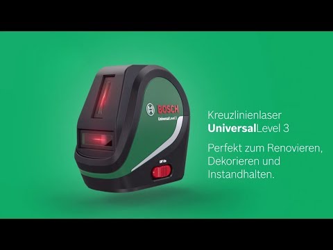 Kreuzlinien-Laser UniversalLevel 3 Set. Perfekt zum Renovieren, Dekorieren und Instandhalten. Projektion eines Laserkreuzes mit zusätzlicher vertikaler Linie im 90° Winkel und Lotpunkt unten. Laserpunkte und Laserlinien richten sich dank der Selbstnivellierfunktion selbstständig und gerade aus. Neigungsfunktion für Arbeiten außerhalb des Selbstnivellierbereichs mit diagonalen Laserlinien. Hochwertige, helle Laserdioden mit einer Genauigkeit von ± 0,5 mm/m für präzise Arbeitsergebnisse. Öffnungswinkel von 120° für lange Laserlinien selbst bei kurzem Arbeitsabstand. Produkt mit Nachhaltigkeitsmerkmalen, weitere Informationen siehe unten. 3 x Batterie 1,5V LR6 (AA). Stativ TT 150 (0 603 691 101). Aufbewahrungshülle. Karton