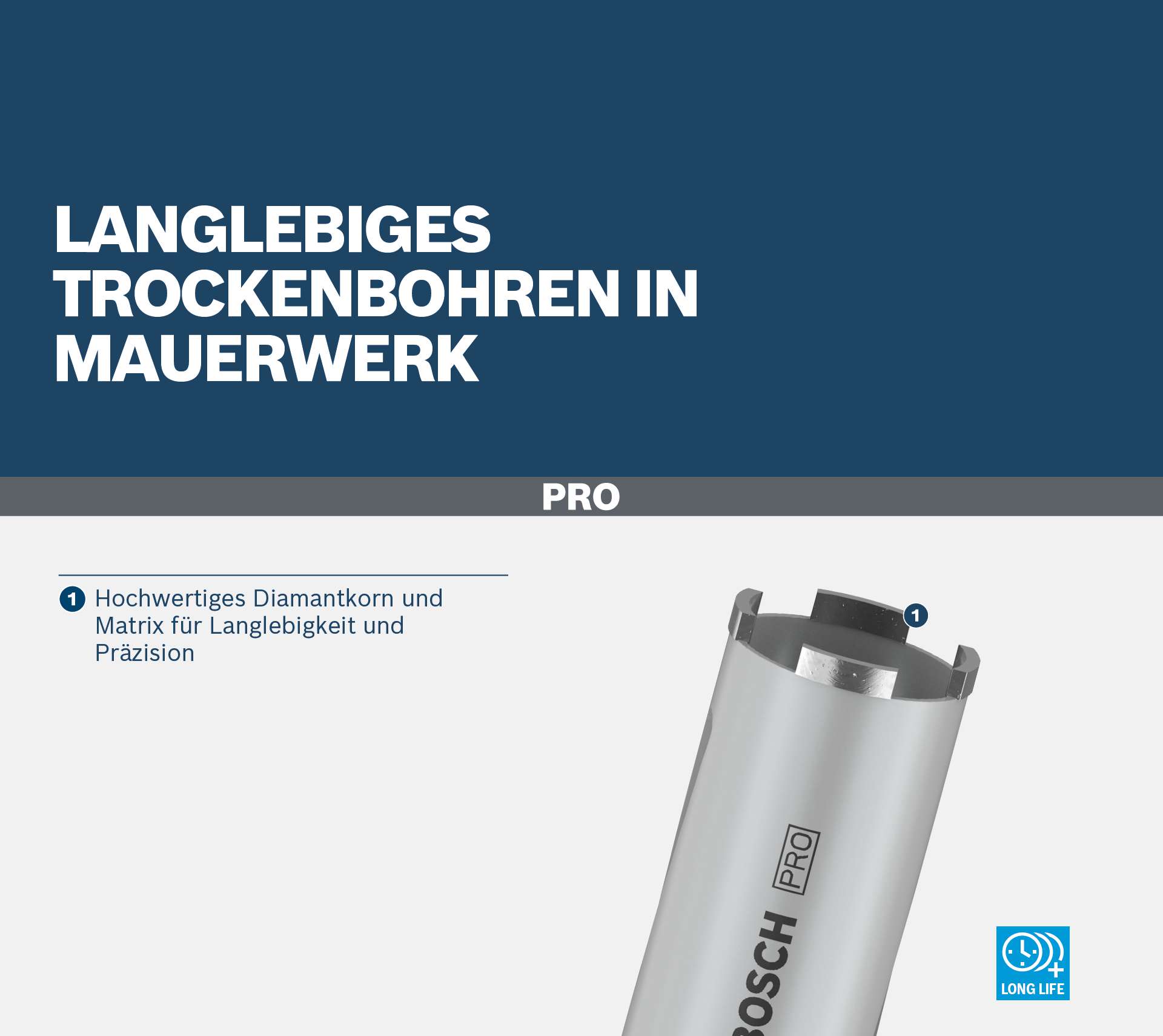 Langlebiges Trockenbohren in Mauerwerk! Hochwertiges Diamantkorn und Matrix für Langlebigkeit und Präzision Das Bohren in die härtesten Baumaterialien ist anstrengend, aber mit dem PRO Core Cutter dry bekommst du die Arbeit auf jeden Fall erledigt. Sie ist langlebig und scharf genug, um alle Materialien zu durchdringen.