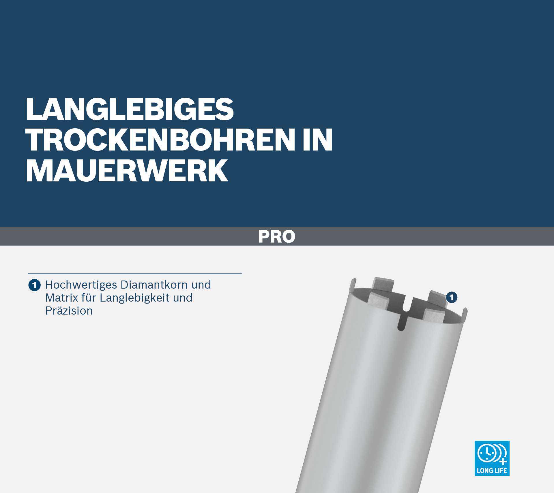 Langlebiges Trockenbohren in Mauerwerk! Hochwertiges Diamantkorn und Matrix für Langlebigkeit und Präzision Das Bohren in die härtesten Baumaterialien ist anstrengend, aber mit dem PRO Core Cutter dry bekommst du die Arbeit auf jeden Fall erledigt. Sie ist langlebig und scharf genug, um alle Materialien zu durchdringen.