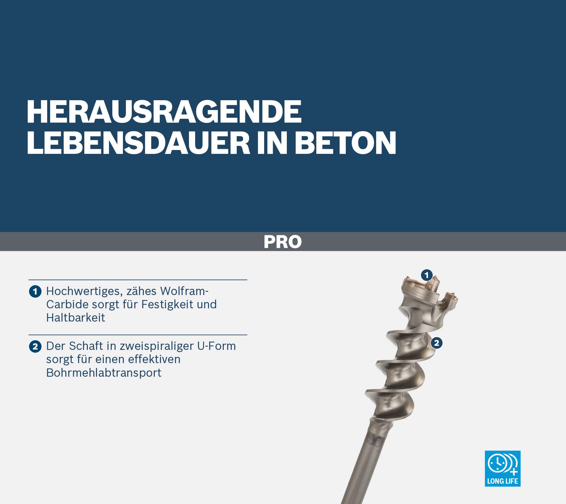 Herausragende Lebensdauer in Beton! Hochwertiges, zähes Wolfram-Carbide sorgt für Festigkeit und Haltbarkeit Für das Bohren großer Durchgangslöcher in Beton muss ein geeigneter Bohrer gewählt werden. Ein Bohrer mit einer Schneidspitze, die stark genug ist, um in das Material zu dringen, und einem Schaft, der Betonteilchen und Staub effizient entfernt. Der PRO SDS max Break Through Bohrer ist die ideale Lösung, denn mit ihm kannst du große Durchgangslöcher bohren ? immer und immer wieder.