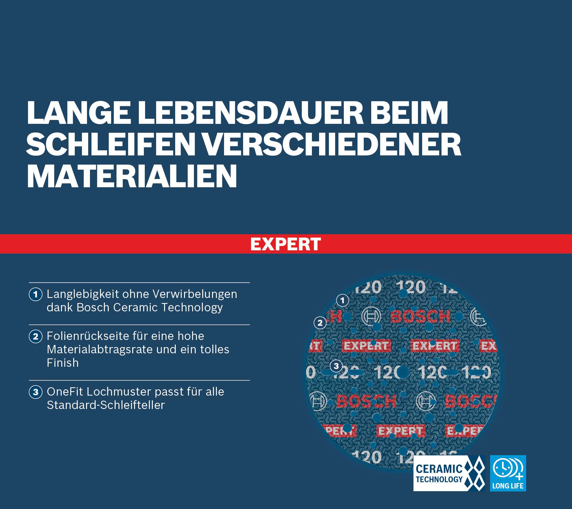Lange Lebensdauer beim Schleifen verschiedener Materialien! Folienrückseite für eine hohe Materialabtragsrate und ein tolles Finish Nicht alle Schleifscheiben eignen sich gleich gut für unterschiedliche Materialien und Anwendungen. EXPERT O780 Foil schon. Wir haben es vielseitig, reißfest und langlebig gemacht, sodass du damit verschiedene Nass- und Trockenschleifarbeiten problemlos erledigen kannst. Eine einzelne Schleifscheibe, mit der du alte Farbe und Rost von Metall und Holz entfernen kannst? Und zudem der Oberfläche deines Werkstücks ein tolles Finish verleihen? Mit der EXPERT O780 Foil kannst du all diese Aufgaben mühelos erledigen. Die Scheibe kombiniert Ceramic Technology ? starke, selbstschärfende Keramikkörner ? und unsere innovative Folienrückseite, um sicherzustellen, dass du eine Vielzahl von Materialien schleifen kannst ? und zwar immer wieder. Langlebigkeit ohne Schleifkringel dank Bosch Ceramic Technology