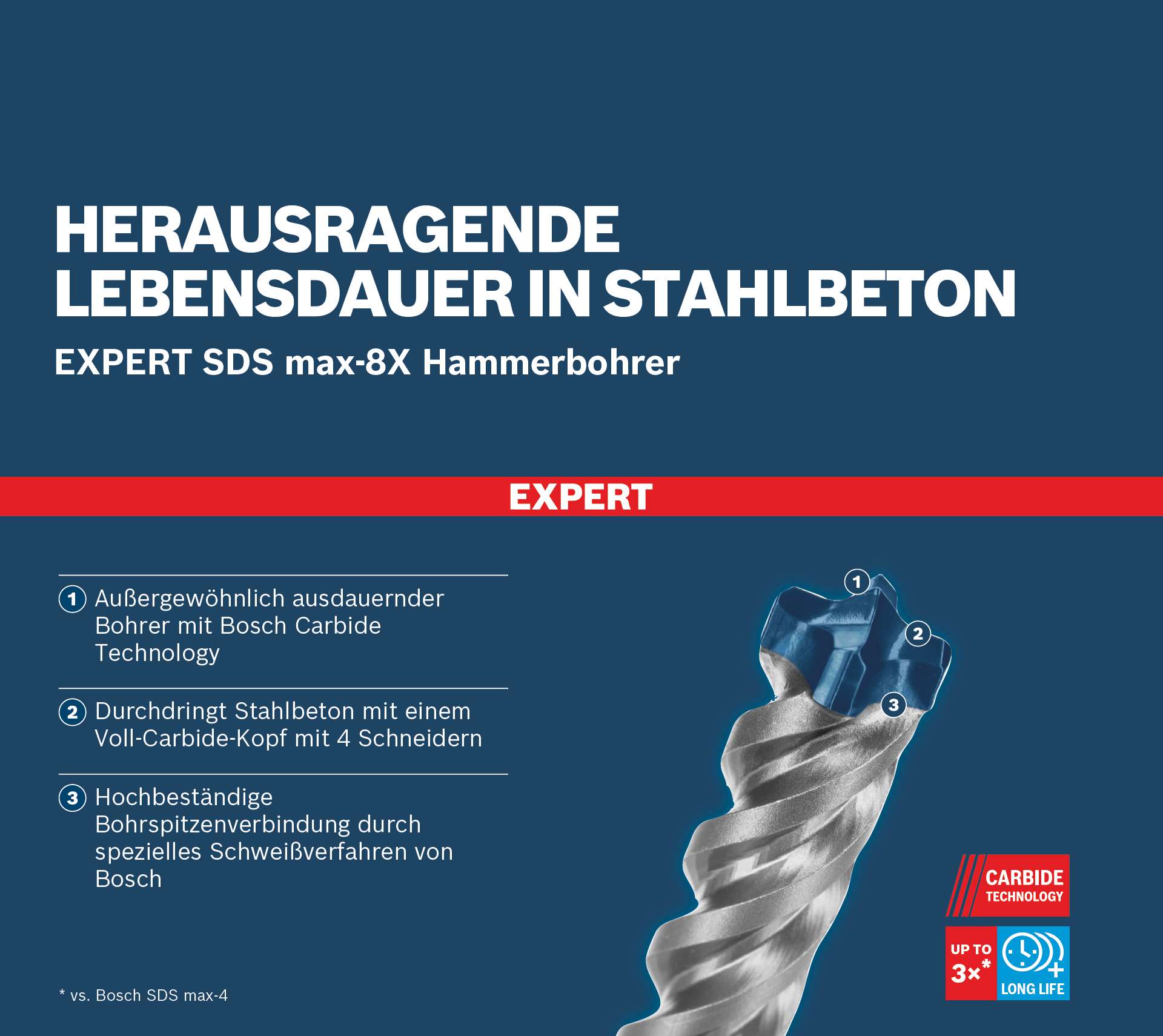 Herausragende Lebensdauer in Stahlbeton! Durchdringt Stahlbeton mit einem Voll-Carbide-Kopf mit 4 Schneidern Das Bohren durch Stahlbeton ist eine schwierige Aufgabe, die den Hammerbohrern viel abverlangt. Sogar 4-Schneider nutzen sich schnell ab. Beim Wechseln des Zubehörs und beim Kaufen von Verbrauchsmaterialien kommt es zu Ausfallzeiten. Der Vollhartmetallkopf auf dem EXPERT SDS max-8X ist ein fortschrittlicher 4-Schneider, der aus einem einzigen Stück des härtesten Metalls besteht: Es verklemmt nicht und zeigt keine Schwäche beim Hammerbohren. Für Bauprofis, die regelmäßig Beton und Stahlbeton bohren, z. B. für schwere Anker oder Armierungsverlängerungen. Der Bosch EXPERT SDS max-8X Hammerbohrer bietet eine unvergleichliche Leistung, Zuverlässigkeit und Langlebigkeit. Es ist das ideale EXPERT Zubehör für SDS max Bohrhämmer. Außergewöhnlich ausdauernder Bohrer mit Bosch Carbide Technology