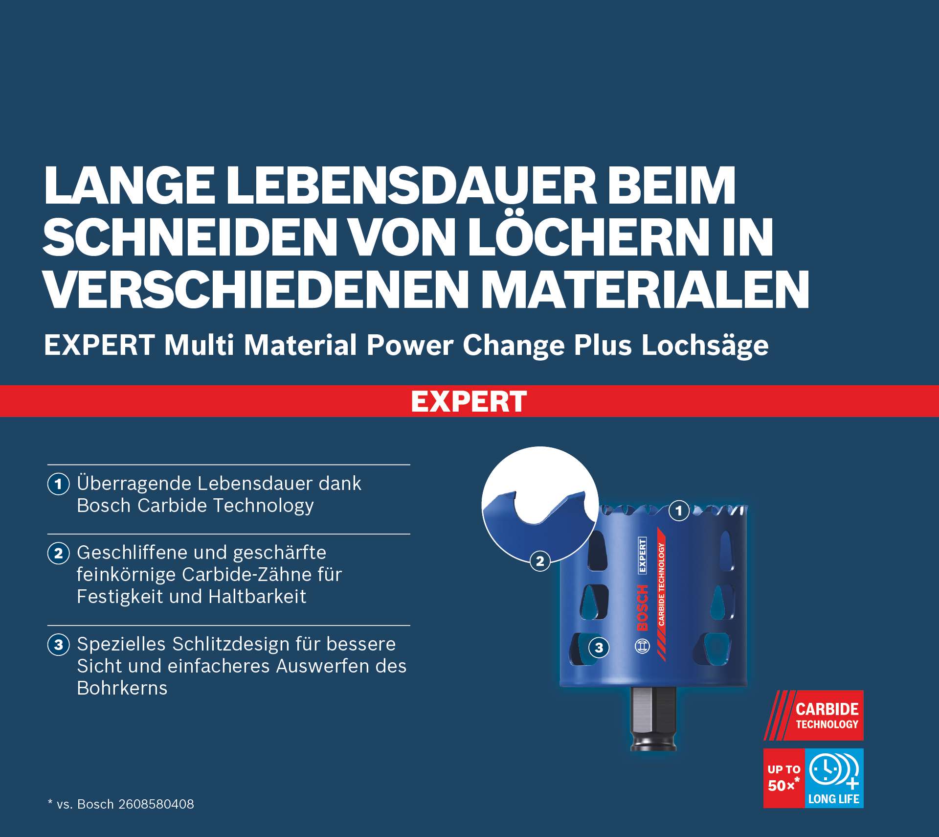 Lange Lebensdauer beim Schneiden von Löchern in verschiedenen Materialen! Geschliffene und geschärfte feine Carbide-Zähne für Festigkeit, Langlebigkeit und Präzision Die meisten Lochsägen für Holz und Metall scheinen gut zu funktionieren ? bis du auf einen gehärteten Nagel oder eine Schraube triffst. Ein kurzer Ruck und jetzt fehlen ein paar Zähne. Mit ihren Carbide-Zähnen wird die EXPERT Multi Material PC Plus Universal-Lochsäge kaum langsamer, wenn sie auf Metall trifft. Sie dringt sauber durch das Material und schneidet dieses zuverlässig. Die Bosch EXPERT Multi Material PC Plus Universal-Lochsäge ein exzellenter Allrounder für jeden professionellen Nutzer ? denn nur ein halbes Loch kann niemand gebrauchen. Überragende Lebensdauer dank Bosch Carbide Technology