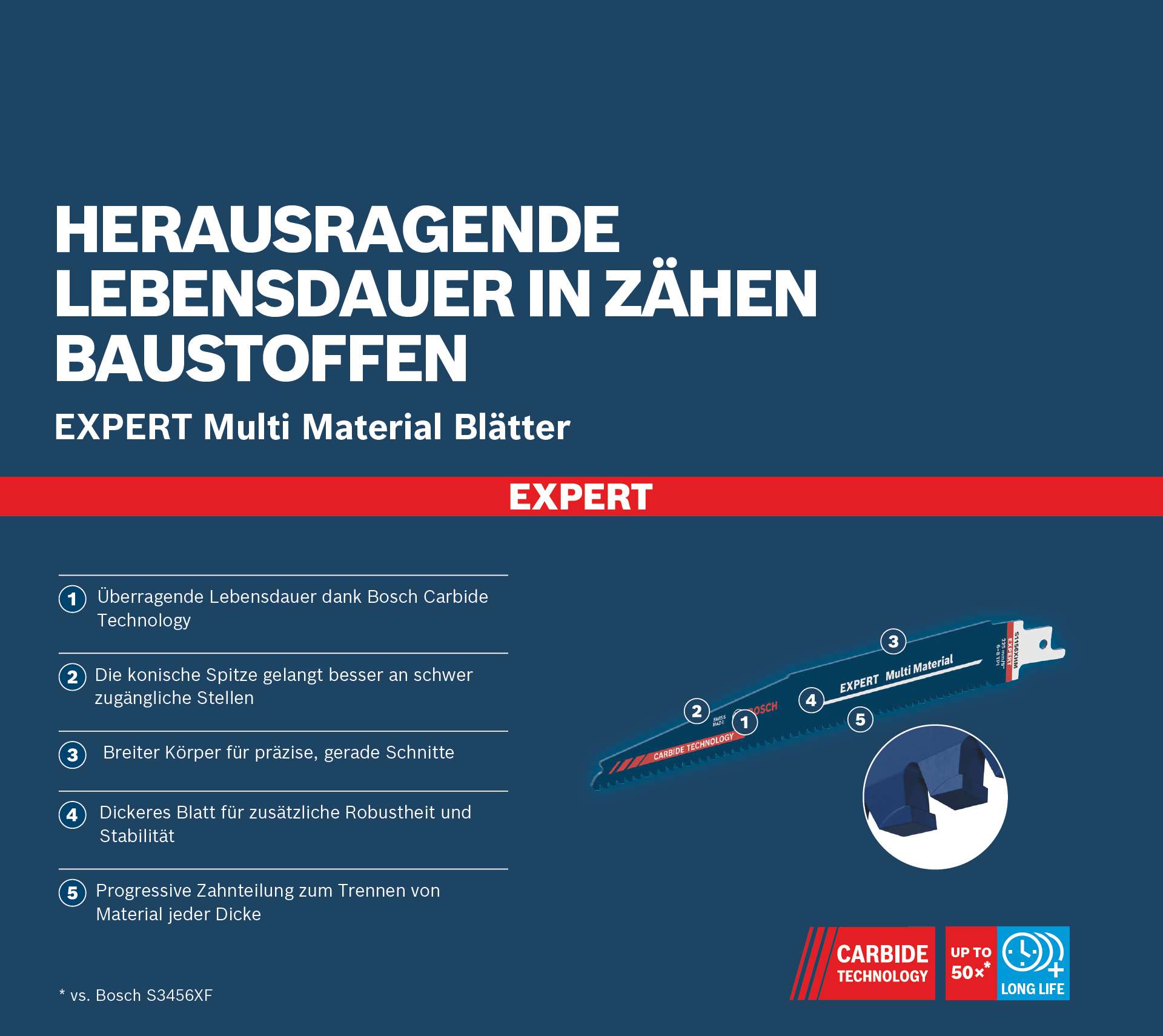 Da das Bosch EXPERT "Multi Material" Säbelsägeblatt so viel länger hält und in jedem Material gute Leistung bietet, ist es für Profis von großem Wert. Sie erreichen mehr Produktivität bei ihrer Arbeit und müssen weniger Blätter kaufen.