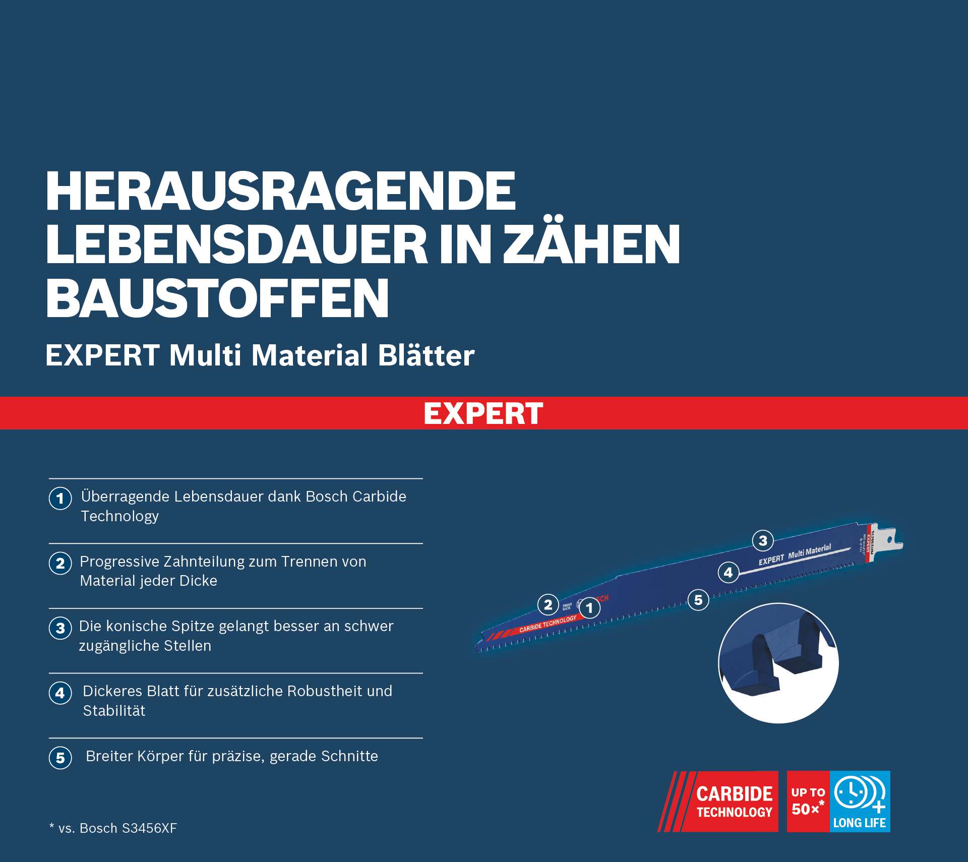 Herausragende Lebensdauer in zähen Baustoffen! Progressive Zahnteilung zum Trennen von Material jeder Dicke Viele Blätter, die angeblich ?für mehrere Materialien? geeignet sind, funktionieren gut in Holz und Baustahl. Härtere Elemente wie Schrauben oder Metallbeschläge können sie allerdings nicht schneiden. Das EXPERT Multi Material hat da keine Probleme: Seine Carbide-Zähne können härteste Stahlsorten schneiden ? immer und immer wieder. Da das Bosch EXPERT Multi Material-Säbelsägeblatt so viel länger hält und in jedem Material gute Leistung bietet, ist es für Profis von großem Wert. Sie erreichen mehr Produktivität bei ihrer Arbeit und müssen weniger Blätter kaufen. Überragende Lebensdauer dank Bosch Carbide Technology