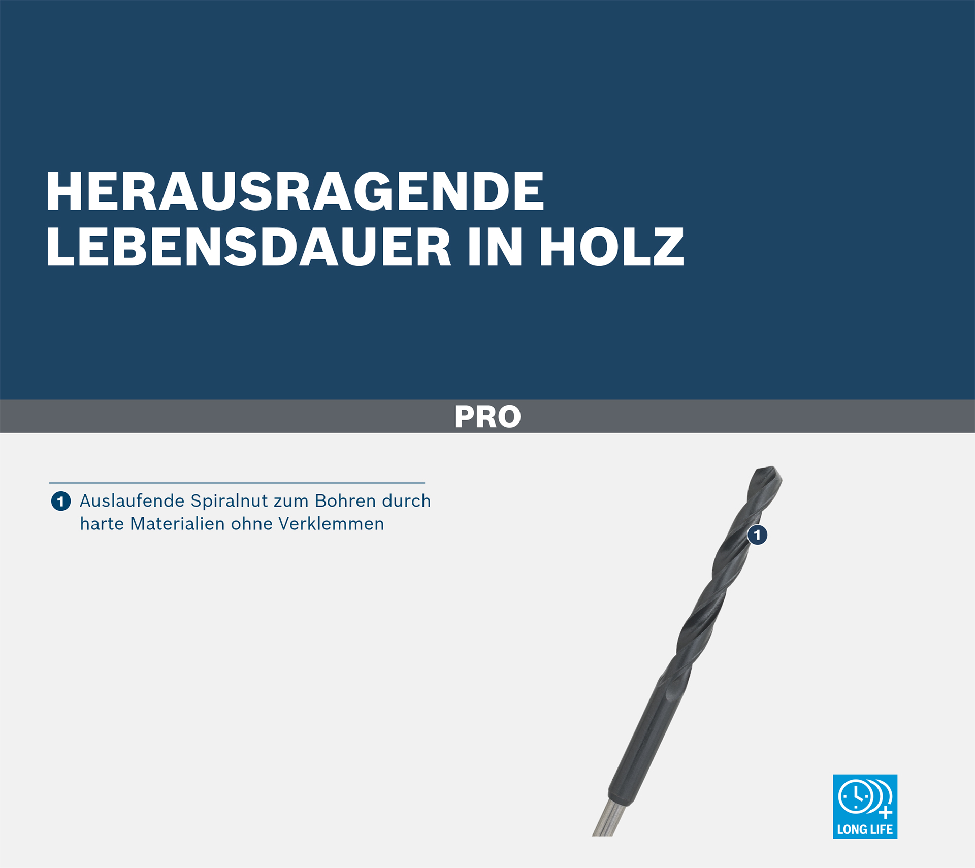 · Auslaufende Spiralnut sowie versetzte Bohrer- und Schaftenden verhindern das Verklemmen auch in feuchtem Holz.