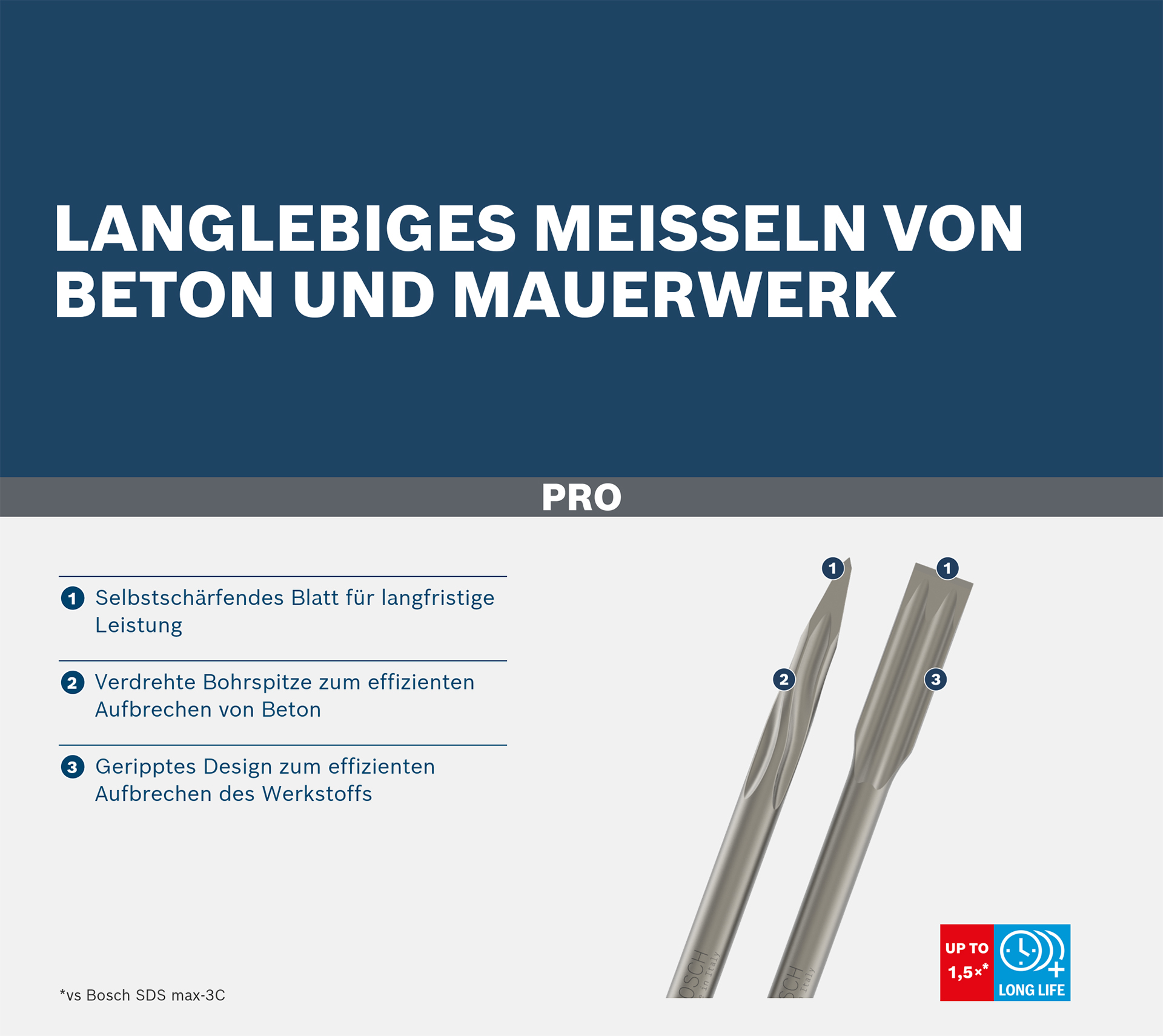 Langlebiges Meißeln von Beton und Mauerwerk! Selbstschärfendes Blatt für langfristige Leistung Abbruch- und Bauarbeiter profitieren vom PRO SDS max-5C Meißel-Set. Es umfasst langlebige SDS max-5C Spitz- und Flachmeißel zum effektiven Aufbrechen von Beton und Mauerwerk.