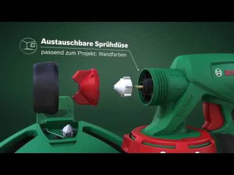 Farbsprühsystem PFS 5000 E. Ganz ohne Pinsel ? schneller und gleichmäßiger Auftrag auf strukturierten Oberflächen und Kanten. ALLPaint-Sprühsystem: zum Sprühen von Wandfarben, Lasuren oder Lacken auf Holz oder Metall. Schneller Farbauftrag mit 3 m²/min für große bis sehr große Projekte im Innen- und Außenbereich. 1.200-W-Motor bietet den besten Farbauftrag seiner Klasse für blitzschnelle Ergebnisse. Zwei große 1.000-ml-Farbbehälter sparen wertvolle Zeit durch selteneres Nachfüllen während der Arbeit. Feine Farbzerstäubung für gleichmäßiges, tropffreies Auftragen auf alle Oberflächen. Düse für Wandfarbe (weiß). Düse für Lacke (schwarz). Düse für Lacke (schwarz). Farbfilter. Reinigungsbürste. 2 x 1000 ml Farbbehälter mit Deckel (1 600 A00 1GG). Kartonschachtel