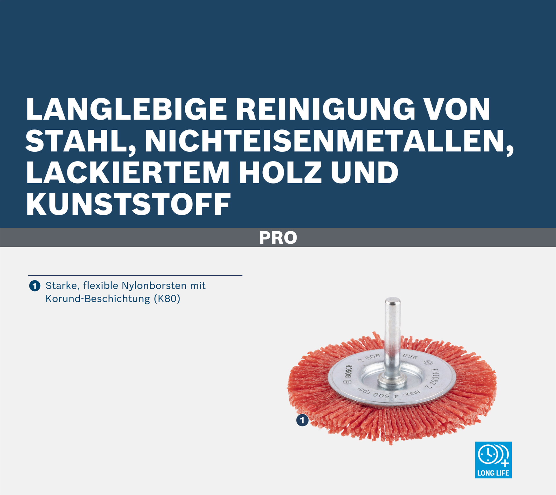 Langlebige Reinigung von Stahl, Nichteisenmetallen, lackiertem Holz und Kunststoff! Starke, flexible Nylonborsten mit Korund-Beschichtung (K80) Benötigst du eine vielseitige Scheibenbürste, mit der du verschiedene Materialien reinigen kannst? Eine Scheibenbürste, die flexibel ist, sich den Konturen deines Werkstücks anpasst und die Oberfläche nicht beschädigt? Dann ist die PRO Multi Material clean Scheibenbürste die richtige Wahl. Wir haben Nylonborsten verwendet, die mit starken Schleifkörnern beschichtet sind, damit du ein gutes Ergebnis ? immer und immer wieder.
