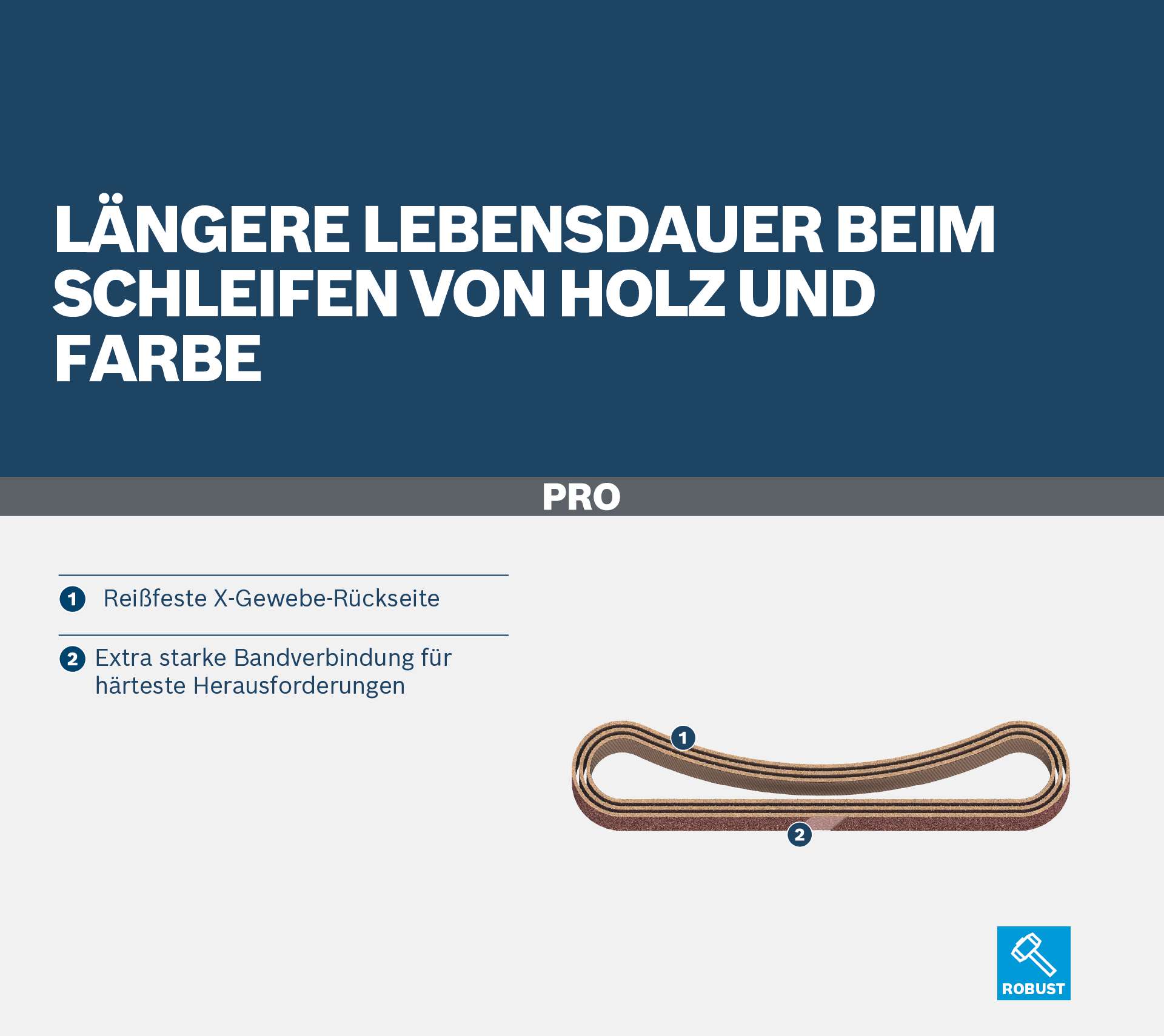 Längere Lebensdauer beim Schleifen von Holz und Farbe! Reißfeste X-Gewebe-Rückseite Benötigst du ein langlebiges und starkes Schleifband, das du auf rauen Oberflächen verwenden kannst? Das PRO X440 verfügt über spezielle Verstärkungen, damit du die Arbeit erledigen kannst ? immer und immer wieder.