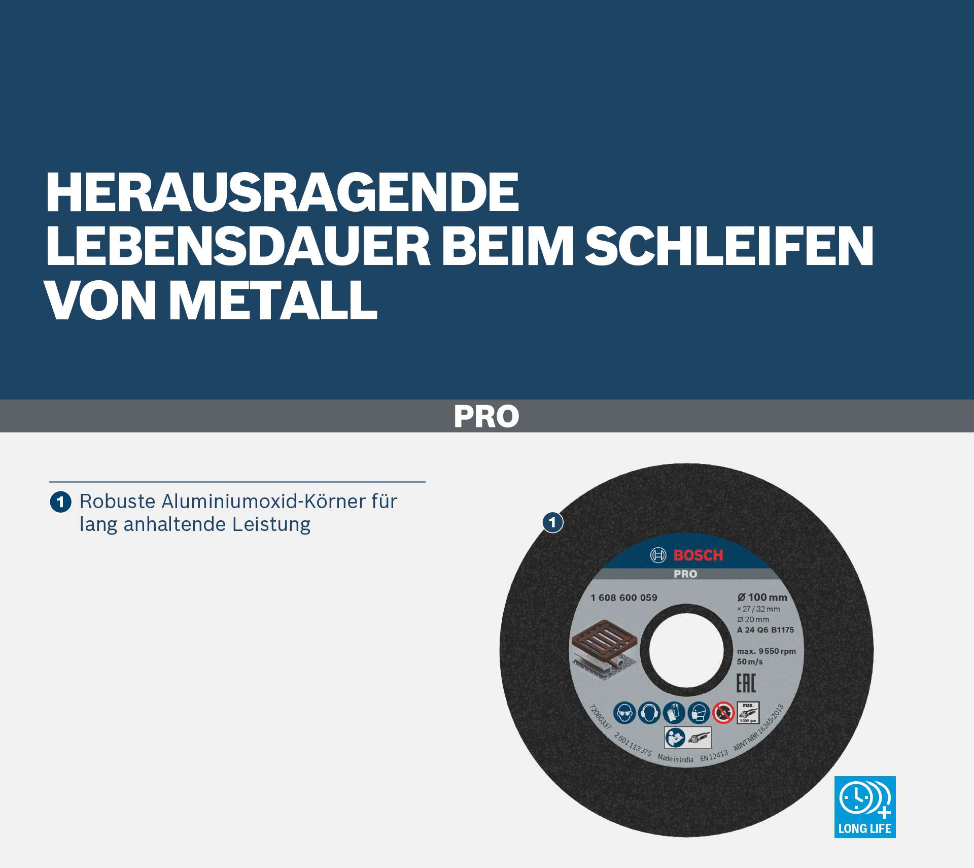 Herausragende Lebensdauer beim Schleifen von Metall! Robuste Aluminiumoxid-Körner für lang anhaltende Leistung Benötigst du eine starke und langlebige Schleifscheibe zum Nachschärfen deiner Werkzeuge? Oder um die Oberfläche von Metall und Gusseisen zu reinigen? Die Kombination aus Schleifkörnern in Premiumqualität und starkem Bindungsmaterial verleiht dem PRO Metal die Stärke und Ausdauer, die du für die Erledigung deiner Arbeit benötigst.