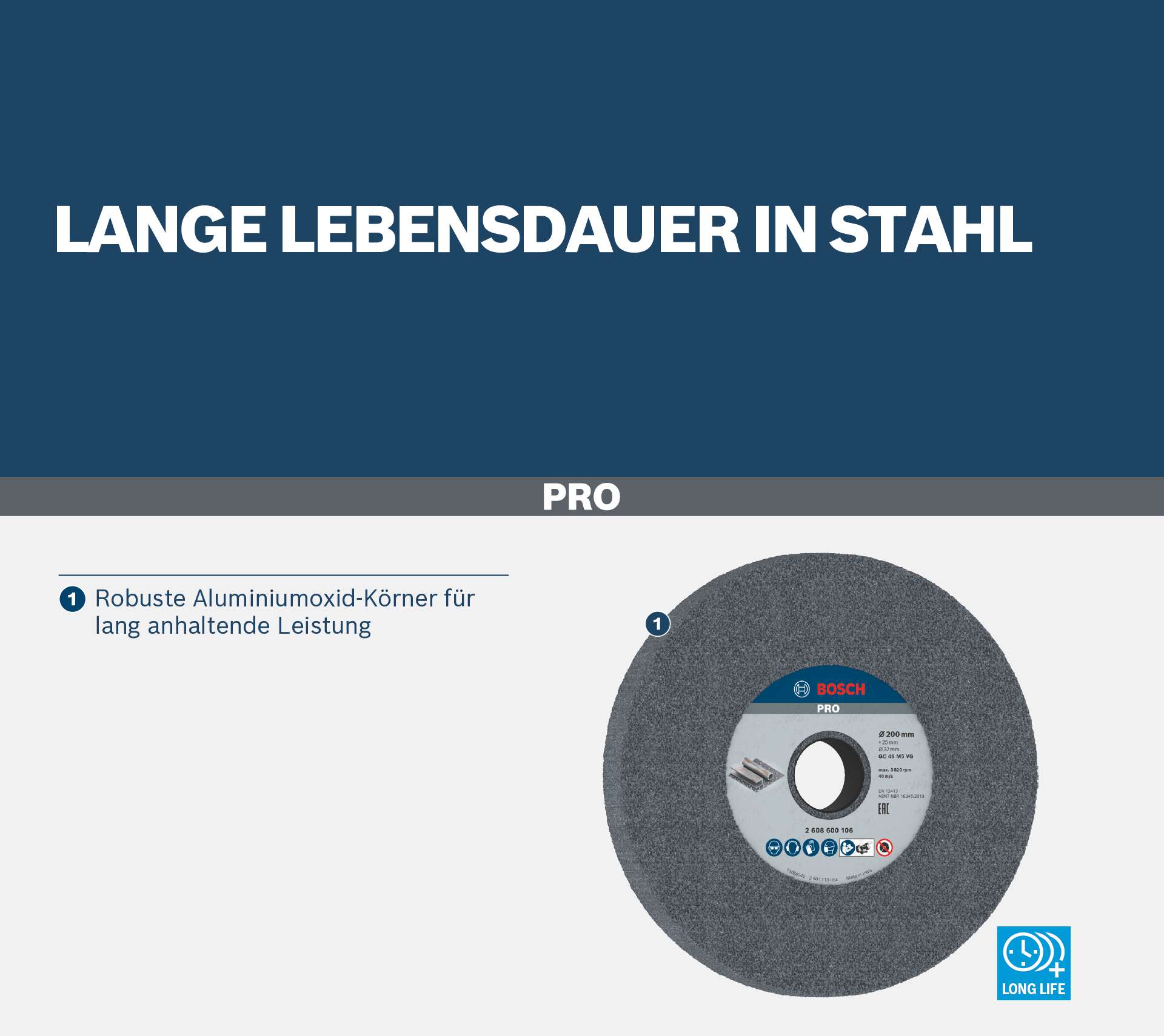 Lange Lebensdauer in Stahl! Robuste Aluminiumoxid-Körner für lang anhaltende Leistung Benötigst du eine starke und langlebige Schleifscheibe zum Reinigen der Metalloberflächen deines Werkstücks? Die Kombination aus Schleifkörnern in Premiumqualität und starkem Bindungsmaterial verleiht dem PRO Metal die Stärke und Ausdauer, die du für die Erledigung deiner Arbeit benötigst.