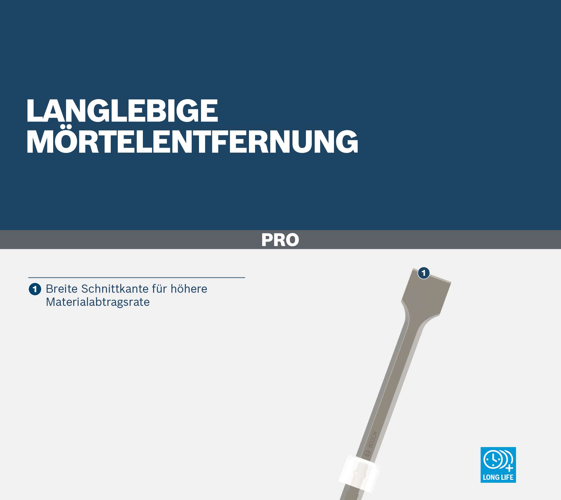 Langlebige Mörtelentfernung! Breite Schnittkante für höhere Materialabtragsrate Bist du Renovierer von Innenräumen und benötigst einen langlebigen Meißel, um Mörtel und Putz von Wänden und Böden zu entfernen? Wir haben den PRO HEX 19-4C entwickelt, damit du die Arbeit zuverlässig erledigen kannst.