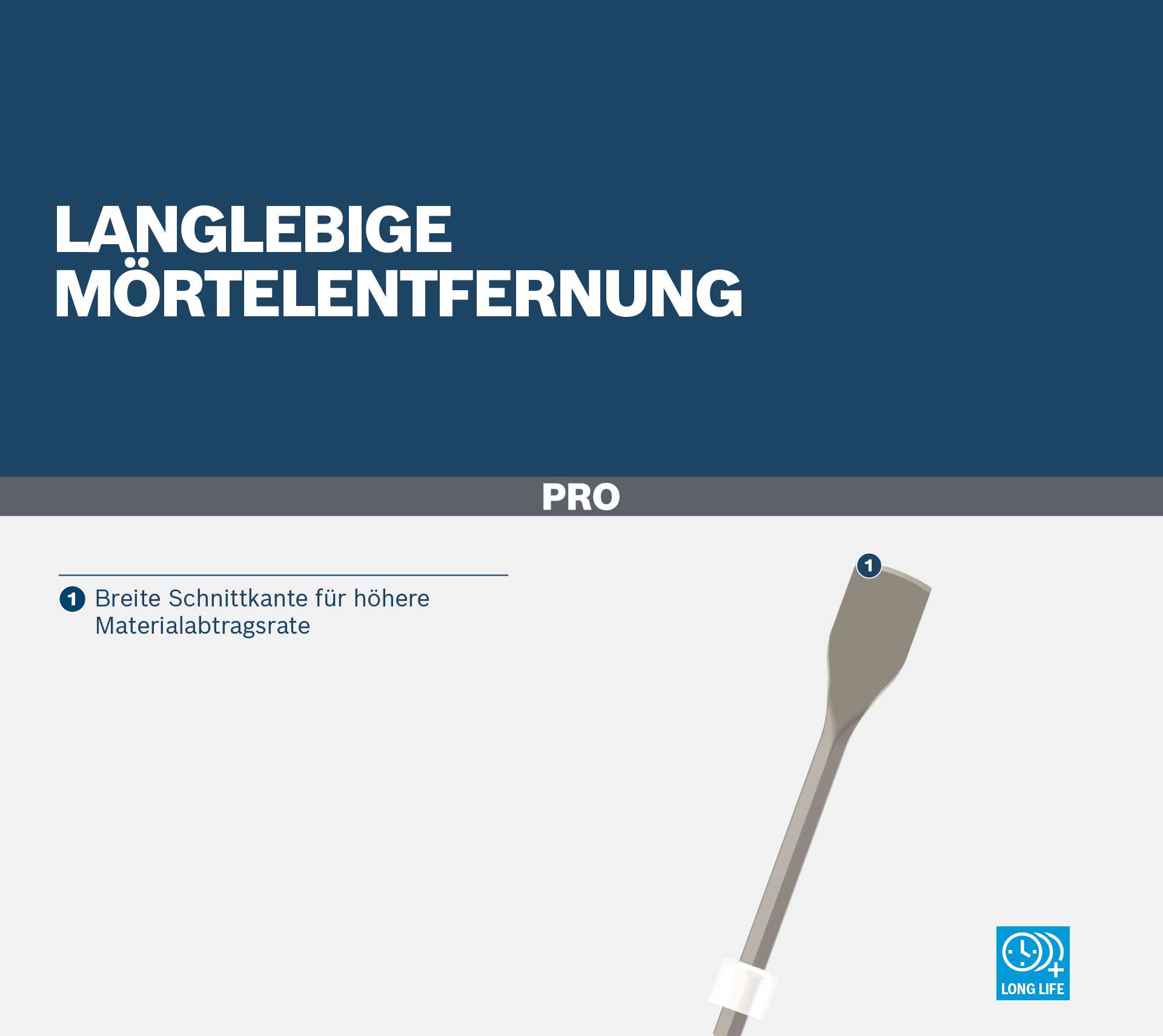 Langlebige Mörtelentfernung! Breite Schnittkante für höhere Materialabtragsrate Bist du Renovierer von Innenräumen und benötigst einen langlebigen Meißel, um Mörtel und Putz von Wänden und Böden zu entfernen? Wir haben den PRO HEX 19-4C entwickelt, damit du die Arbeit zuverlässig erledigen kannst.