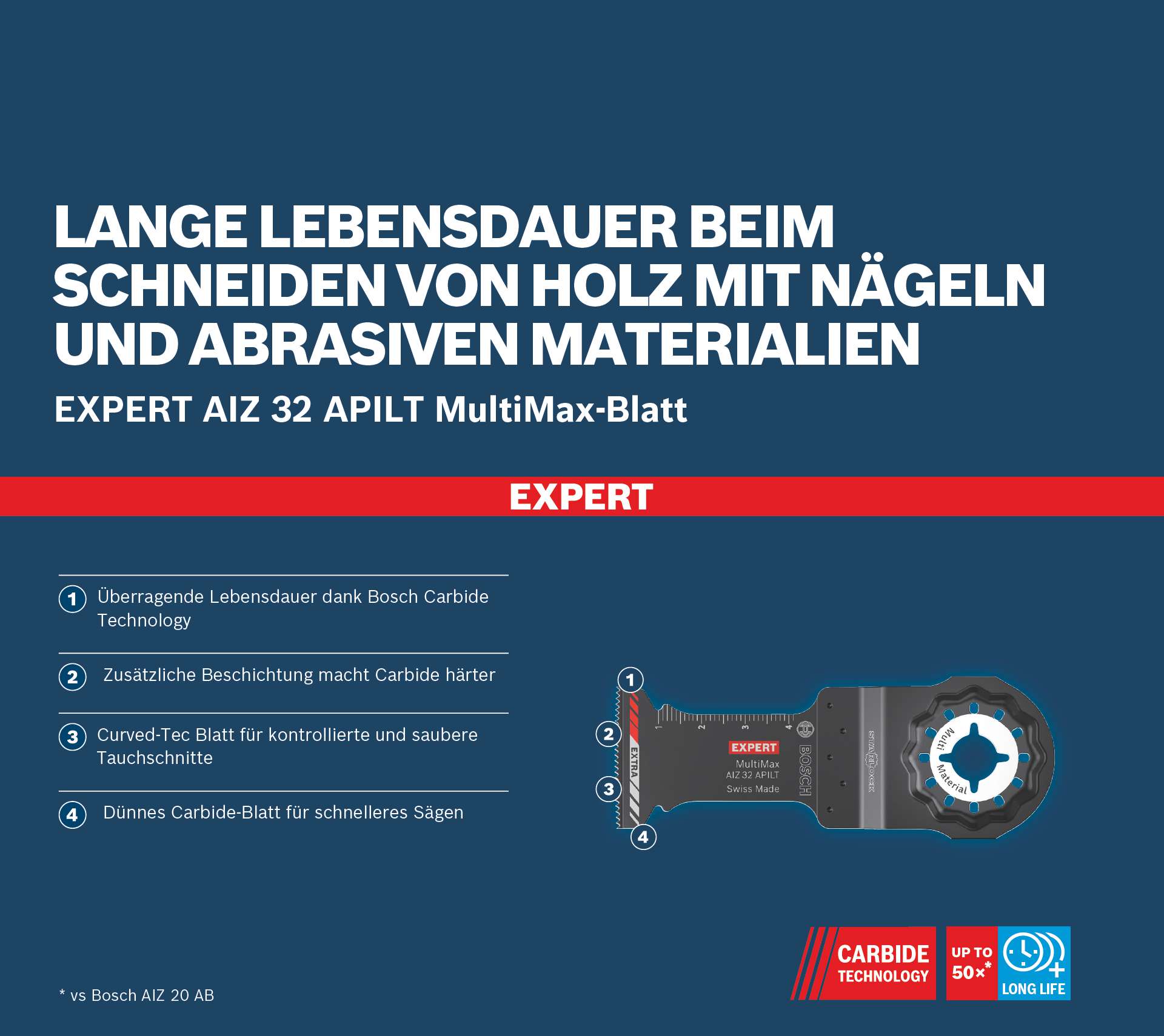 Lange Lebensdauer beim Schneiden von Holz mit Nägeln und abrasiven Materialien! Zusätzliche Beschichtung macht Carbide härter Ein Blatt für Multifunktionswerkzeuge, mit dem du hervorragende Schnitte in verschiedensten Materialien machen kannst, erleichtert das Arbeiten erheblich. Darum haben wir das EXPERT AIZ 32 APILT MultiMax-Tauchsägeblatt entwickelt. Mit ihm kannst du präzise Schnitte und Tauchschnitte in Holz mit Nägeln, Ziegelstein und andere Verbundwerkstoffe und abrasive Materialien machen ? effizient und mühelos. Das dünne, lange Blatt des EXPERT AIZ 32 APILT MultiMax-Blatts ist außergewöhnlich langlebig und ermöglicht Tauchschnitte mit einer Tiefe von bis zu 45 mm. Die konischen Carbide-Zähne mit dem innovativen Curved-Tec-Profil sind robust und scharf. Sie sind dafür ausgelegt, Späne effizient zu entfernen und Hitzeverfärbungen zu reduzieren ? insbesondere beim Schneiden in Holz. Überragende Lebensdauer dank Bosch Carbide Technology