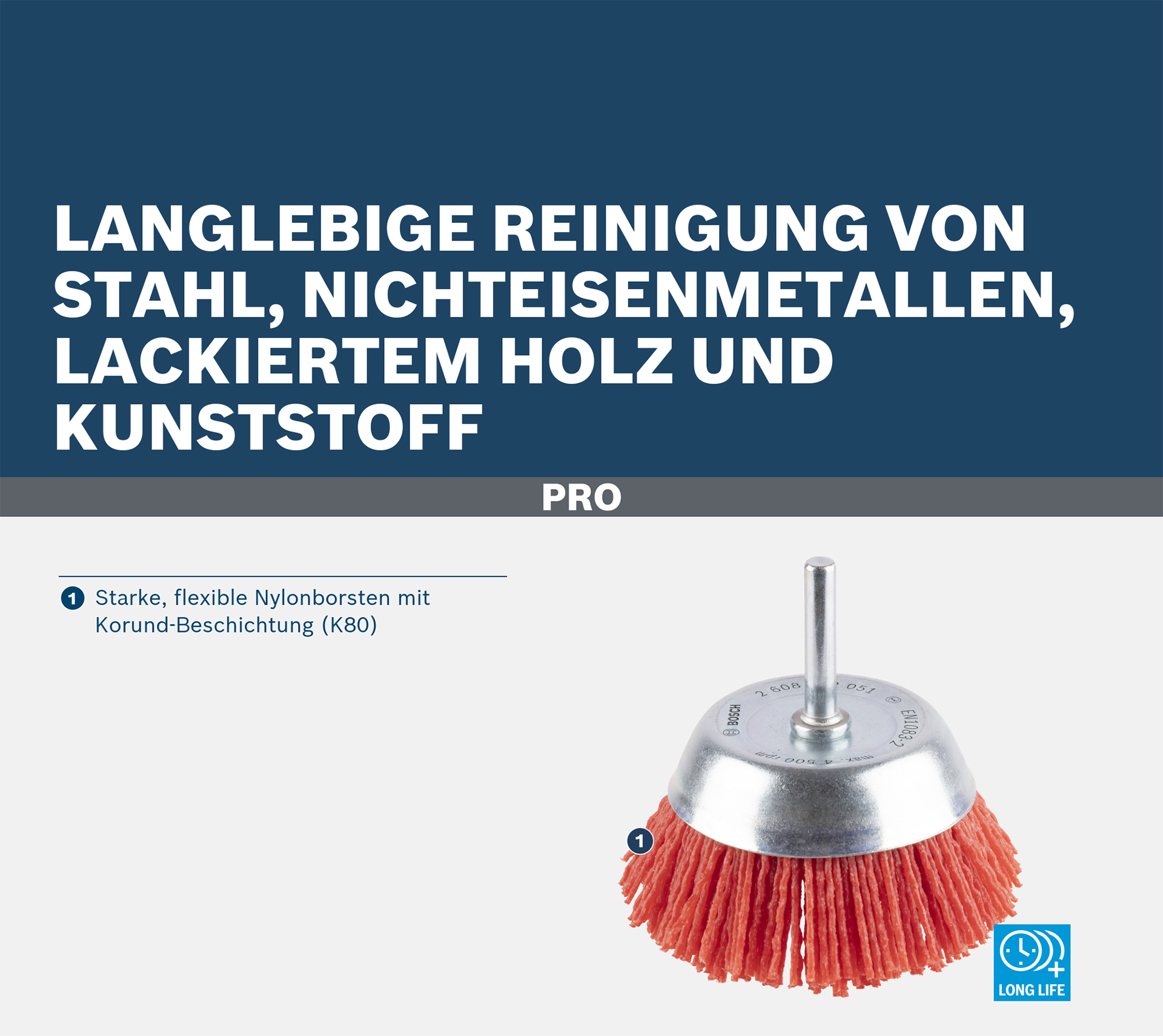 Langlebige Reinigung von Stahl, Nichteisenmetallen, lackiertem Holz und Kunststoff! Starke, flexible Nylonborsten mit Korund-Beschichtung (K80) Benötigst du eine vielseitige Topfbürste, mit der du verschiedene Materialien reinigen kannst? Eine Topfbürste, die flexibel ist und dein Werkstück nicht beschädigt? Dann ist die PRO Multi Material clean Topfbürste die richtige Wahl. Wir haben Nylonborsten verwendet, die mit starken Schleifkörnern beschichtet sind, damit du ein gutes Ergebnis ? immer und immer wieder.