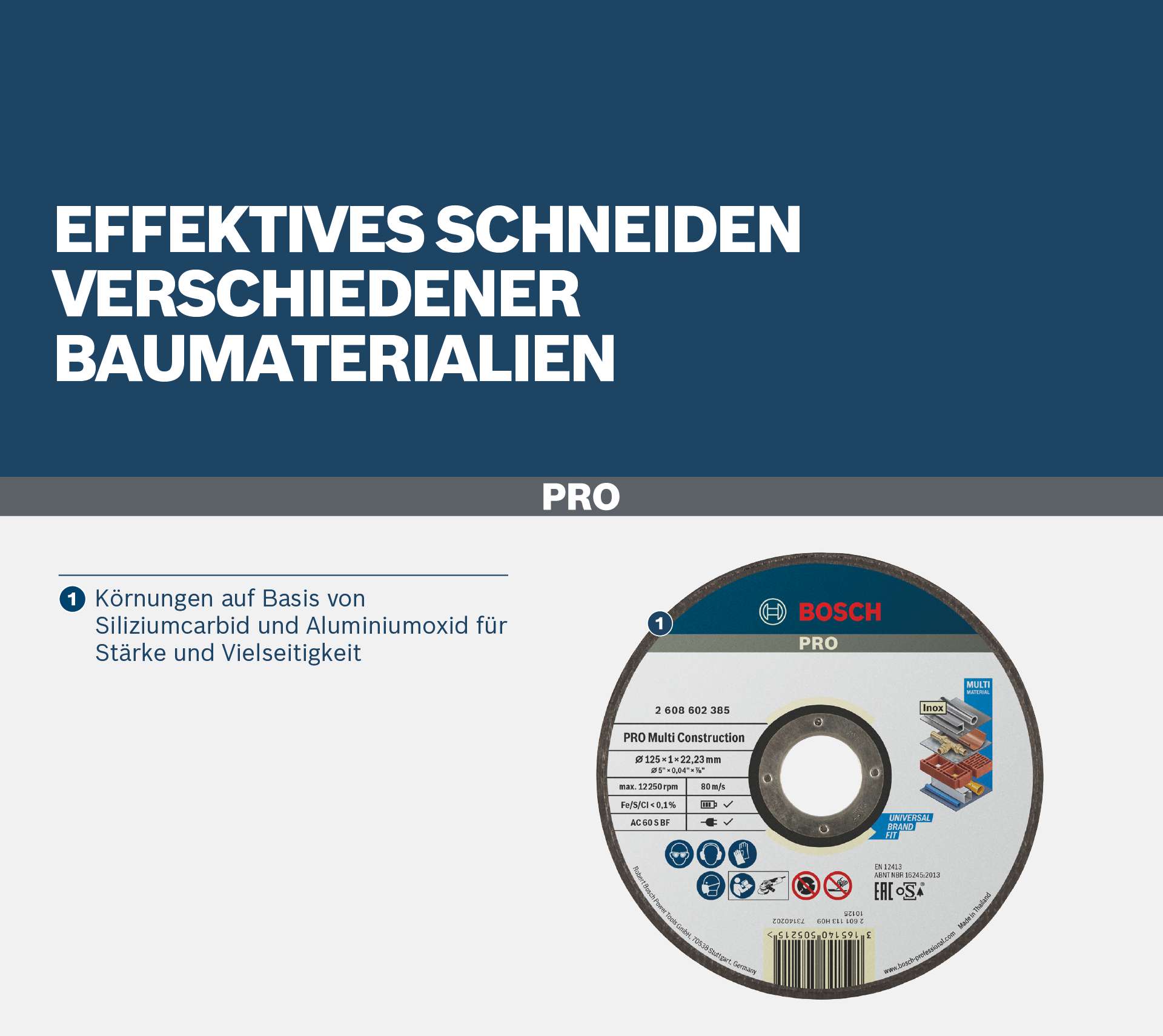 Effektives Schneiden verschiedener Baumaterialien! Körnungen auf Basis von Siliziumcarbid und Aluminiumoxid für Stärke und Vielseitigkeit Bei der Arbeit auf einer Baustelle müssen häufig verschiedene Baumaterialien zugeschnitten werden. Mit einer vielseitigen Trennscheibe sparst du Zeit und Energie. Aus diesem Grund haben wir PRO Multi Construction entwickelt. Durch die spezielle Schleifmittelmischung können wir sicherzustellen, dass unterschiedliche Materialien effektiv geschnitten werden.