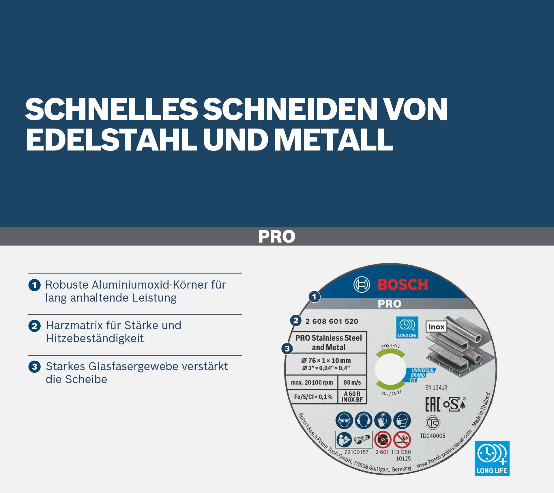 Spezifikation: A 60 R INOX BF. Durchmesser: 76 mm, Bohrungsdurchmesser: 10 mm, Dicke: 1 mm. 5er-Pack. Für Akku-Winkelschleifer mit 10-mm-Aufnahme.