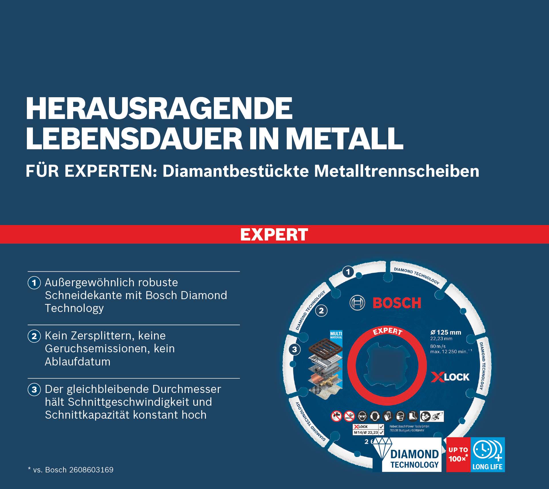 Die X-LOCK Diamant-Metallscheibe hat beim Schneiden von Metall eine bis zu 100 Mal längere Lebensdauer. Ihr Stahlkörper mit Diamantschneidekante ist äußerst robust und die Scheibe behält während seiner langen Lebensdauer die gleiche Schnitttiefe und eine konstante Geschwindigkeit bei. Dank der Diamanttechnologie von Bosch splittert die Scheibe auch bei versehentlichem Herunterfallen nicht. Sie erzeugt beim Schneiden keinen chemischen Geruch oder zusätzlichen Staub. Sie ist zum Schneiden von Metallen wie Stahl, Gusseisen, Edelstahl und Kupfer vorgesehen. Diamant-Metallscheiben von Bosch erfüllen die höchsten Sicherheitsanforderungen, wie z. B. EN 13236. X-LOCK Diamant-Metallscheiben passen auch auf Standard-Winkelschleifer