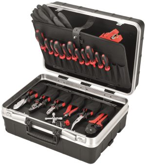 Industriekoffer mit Trolleyfunktion und 21 Qualitätswerkzeugen. Robuster Werkzeugkoffer mit Trolley Funktion aus stoßfestem Kunststoff mit stabilem Aluminiumrahmen, Zwei robuste, abschließbare Kippschlösser, Bodenschale im Spritzgussverfahren hergestellt mit zahlreichen Unterteilungsmöglichkeiten, Herausnehmbare Bodenabdeckplatte, einseitig mit Werkzeugtaschen bestückt, Herausnehmbare Werkzeugtafel mit Dokumentenfach und einer Vielzahl von Werkzeugeinsteckfächern, Größe: LxBxH: 395x455x205 mm, Gewicht: leer 3450 g, Werkzeugkoffer-Bestückung: 1 x VDE-Kabelschere, für Kabel 18 mm2, 1 x 1000 V Kraft-Seitenschneider 200 mm, 3 x VDE-Schlitz-Schraubendreher SLIM, 2 x VDE -Schraubendreher mit Kombiprofil SLIM, 2 x VDE-Kreuzschlitz(PZ)-Schraubendreher SLIM, 4 x VDE-TORX®-Schraubendreher SLIM, 1 x Elektronik-Seitenschneider ohne Schneidwate 132 mm, 1 x Universal-Schaltschrankschlüssel, 1 x Profi-Schaltschrank-Wasserwaage 250 mm, 1 x Automatische Abisolierzange für flexible Leiter, 1 x Presszange Click`n`Crimp, 1 x Steckschlüssel-Bit-Halter, 1 x Spannungsprüfer 690 V, 1 x Bit-Box Schlitz, 10-teilig PH/PZ, 1 x Schraubenzange, 160 mm