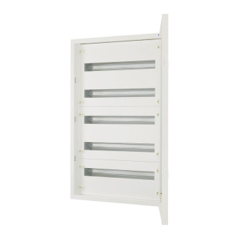 Kompletter BF-U-./..-A Unterputz-Stromverteiler, weiß RAL 9016, 24 Platzeinheiten pro Reihe, 5-reihig, Höhe 920mm, Breite 588 mm, Tiefe 136 mm, einschließlich Tür, Frontschilder, DIN-Schienen-Montagerahmen und neutrale/PE-Klemmen. Gehäuse: geschlossenes Design, einschließlich Rückwand, Rückwand als Befestigungsebene nutzbar, 2 Kabeldurchsteckflansche für schlanke Verteiler mit einer Breite von 24 Teilungseinheiten, oben, vorgeprägte Kabeleinführungsöffnungen unten, Klemmen auf Gehäuse vormontiert (kein Verlust von Teilungseinheiten). Mauerwanne mit Türrahmen, Rückwand als Befestigungsebene nutzbar, leicht ausbrechbare Kabeleinführungsöffnungen