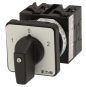 Wendeschalter, Sortiment: Steuerschalter, Typkenner: T0, mit schwarzem Knebel und Frontschild, Kontakte: 5, Schutzart: Front IP65, Bauform: Einbau, Schaltwinkel: 60 °, Schaltverhalten: rastend, mit 0-Stellung, Frontschild: 1-0-2, Bemessungsbetriebsleistung AC-23A, 50 - 60 Hz 400 V: P = 5,5 kW, Bemessungsdauerstrom: Iu = 20 A, 3 Baueinheit(en), Normen und Bestimmungen: IEC/EN 60947, VDE 0660, IEC/EN 60204, CSA, UL, Lasttrennschalter nach IEC/EN 60947-3