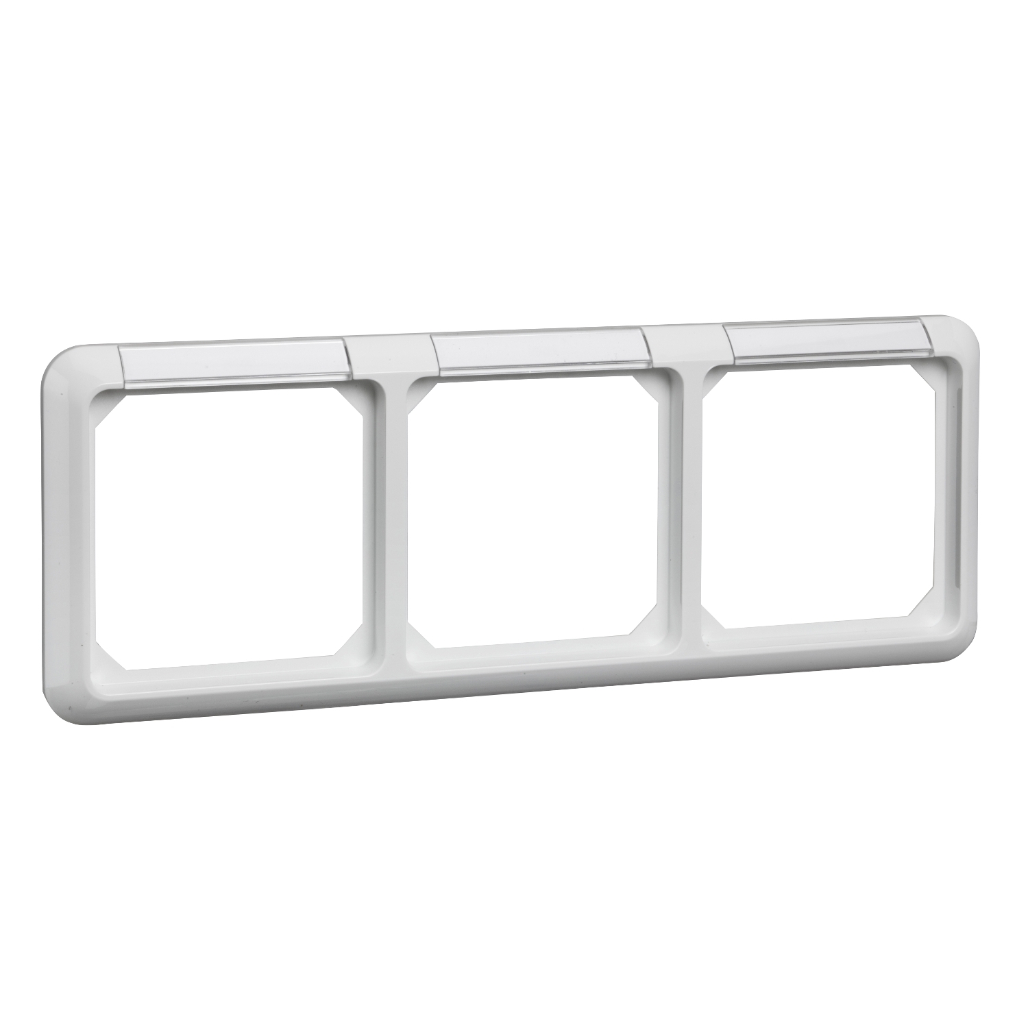 3-fach Rahmen mit Schriftfeld, Farbe reinweiß, geeignet für senkrechte und waagerechte Montage, Durch die Rahmenbreite von 83,5 mm eignet sich ELSO FASHION bruchfest besonders für die Installation in Kanälen mit 80 mm Ausschnitt.