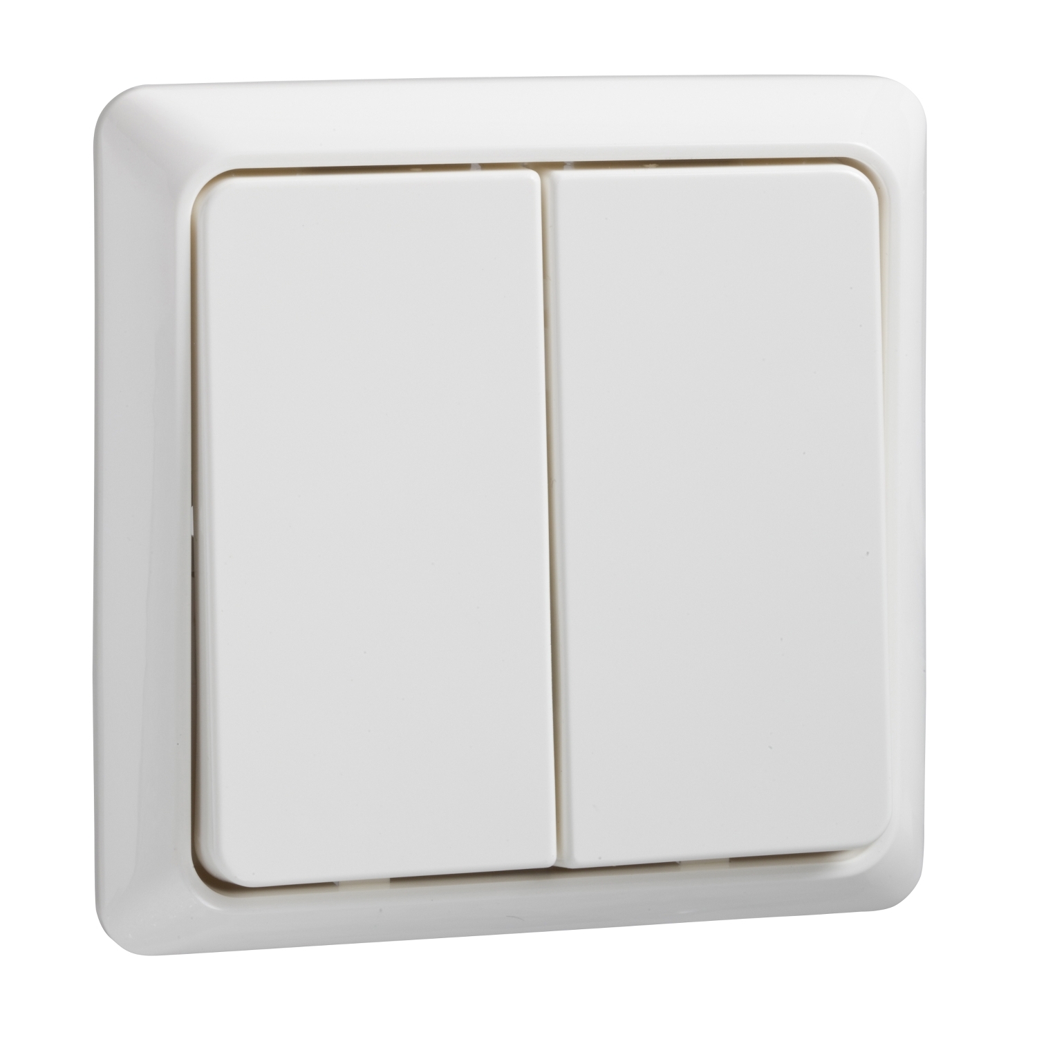 Taster 42 V Nennstrom 1 A Komplettgeräte mit Rahmen und Wippe. Doppeltaster zum Schalten/Dimmen von zwei Fernschaltdimmern. zwei Fernschaltrelais oder Kombination Fernschaltdimmer/Fernschaltrelais Serienfernschaltrelais über zweiadrige Steuerleitung Unterputz. Farbe: reinweiß schraubenloser Klemmanschluss für ein- und vieldrähtige Leiter bis Durchmesser 0,8 mm.