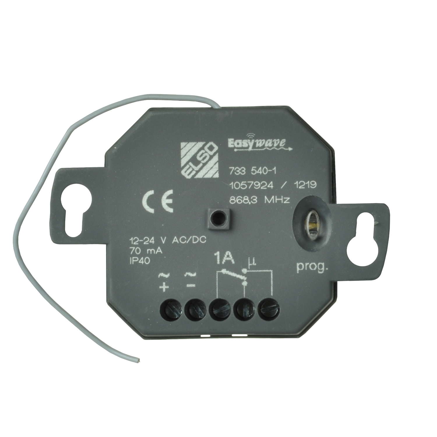 Funk UP Empfänger 1Kanal 24 Mediopt care. 1-Kanal Schaltmodul (1 Schließer). 2-Tastenbedienung mit Funktion EIN/AUS. 1-Tastenbedienung mit Funktion EIN/AUS/EIN, def. AUS bei Bedienzeit > 1,5 s. Tasterfolger-Impuls bis max. 10 s. Versorgungsspannung: 12-24 VAC/DC. Schaltleistung: max. 60 VDC, 1 A, 30 W/max. 125 VAC, 1 A, 62 W. Kontaktart: potentialfreier Wechselkontakt. Einbau: in UP-Dose IP40, Einbautiefe: 28 mm. Funkfrequenz: 868 MHz. Anzahl Speicherplatze: 32.