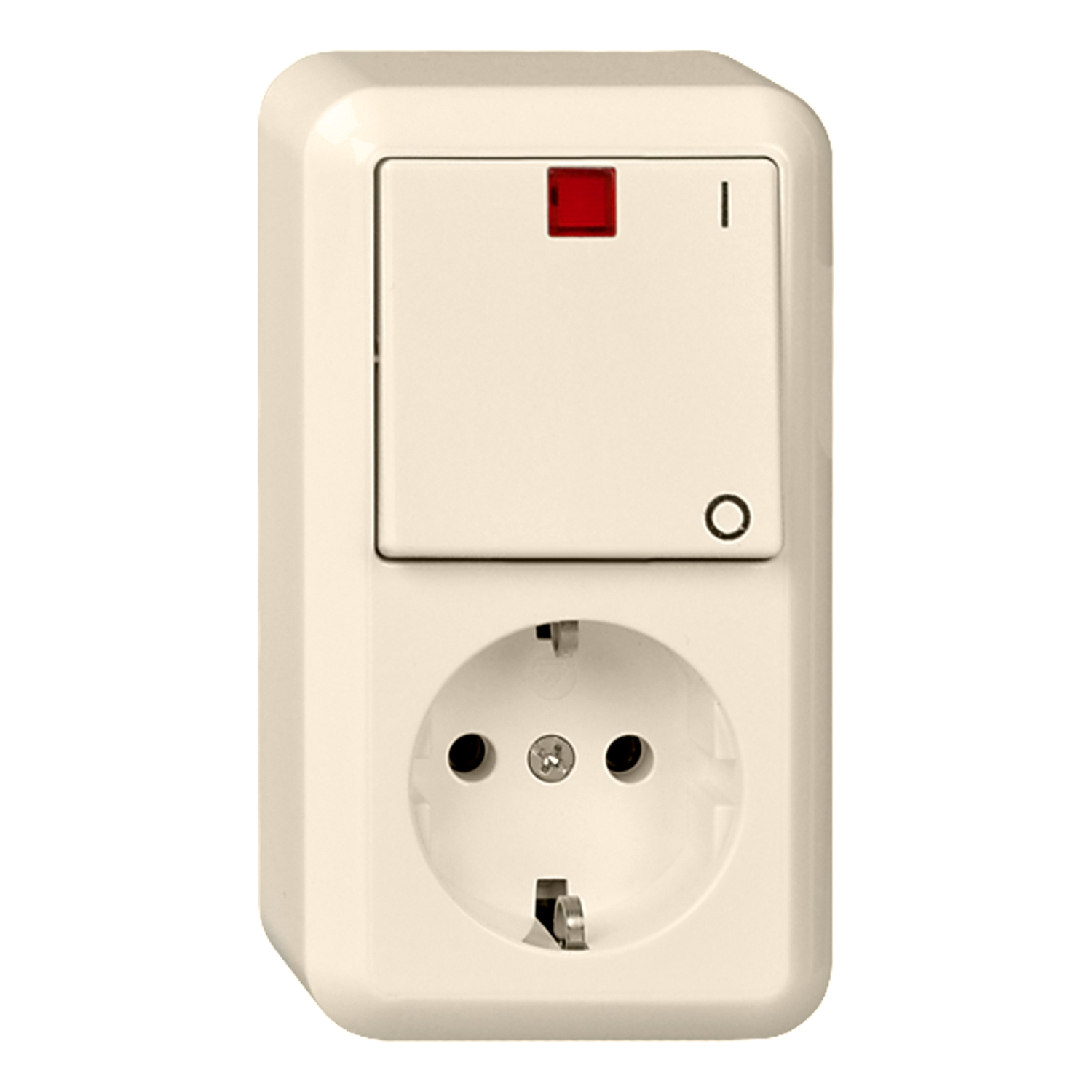 Kombination Kontroll-Ausschalter 2-polig beleuchtet und Steckdose, Farbe: reinweiß, Schalter: 10 A 250V AC, Steckdose 16 A 250V AC, Für Aufputzmontage, Schutzart IP 20, mit Grundplatte, für Montage auf brennbarem Untergrund geeignet. Steckklemmen: Klemmbereich für Kupferleiter 1,5 mm und 2,5 mm.