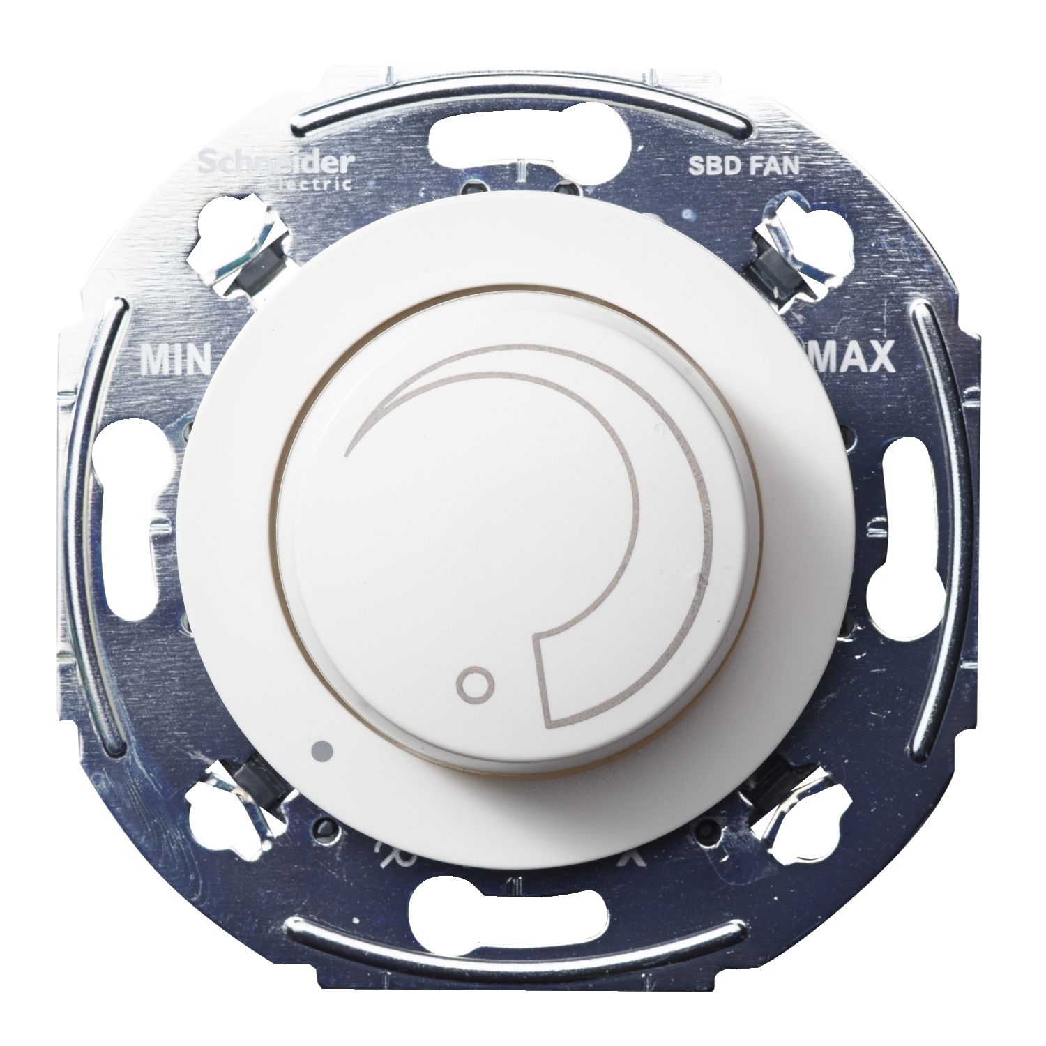 Drehzahlstellereinsatz mit Dreh-Ausschalter, Nur für Ventilatoren und Geräte mit 1-Phasen- Induktionsmotor (230 V, 50 Hz), Mit irreversiblem Thermoschutz, Mit Leuchtmarkierung, Belastbarkeit 20-400 W, mit Zentralplatte weiss RENOVA.
