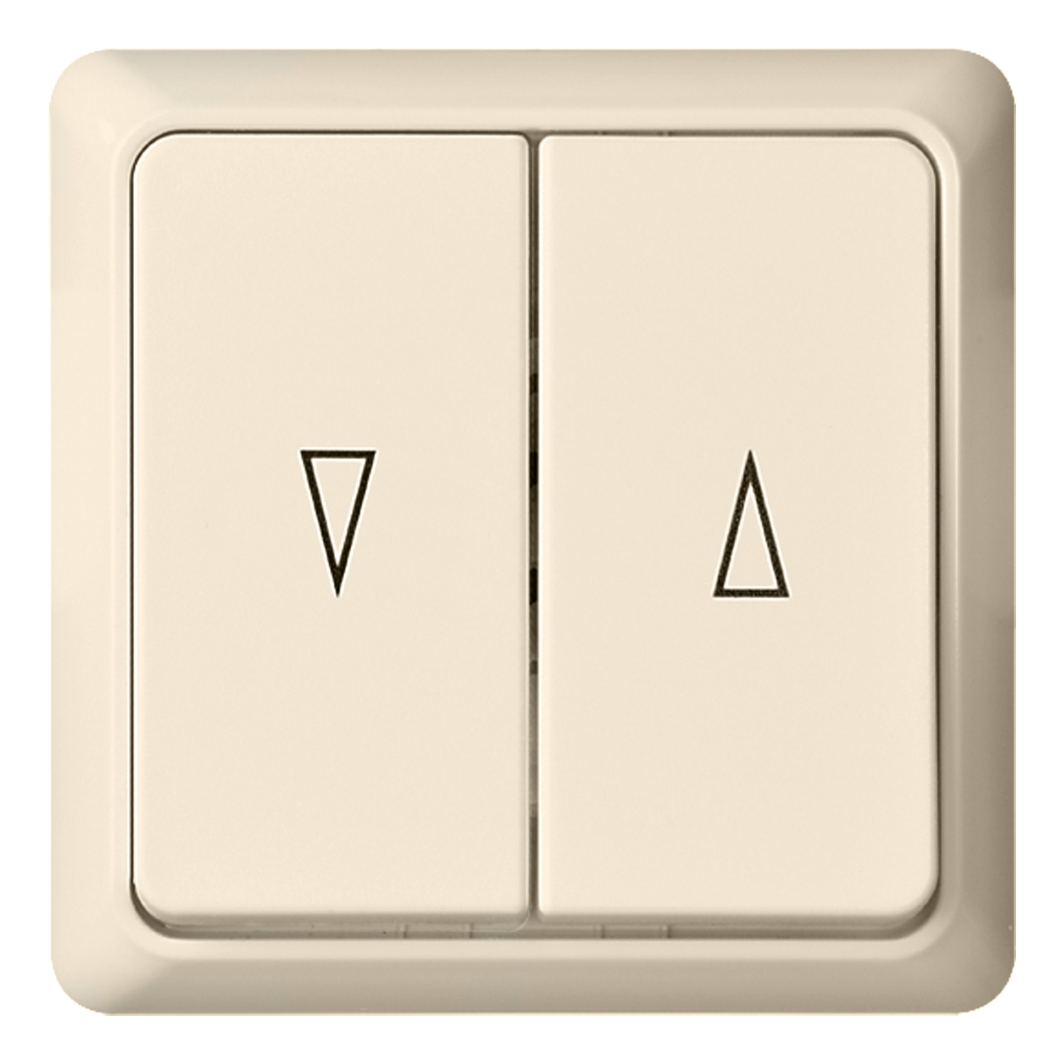Jalousietaster. Farbe: reinweiß, mit mechanischer u. elektrischer Verriegelung gegen gleichzeitige Betätigung, nach Entfernung der Rückstellfeder auch als Jalousieschalter verwendbar, für Unterputzmontage. Schutzart IP 20, Taster 10 A, 250V AC, Rahmen und Wippen aus Thermoplast, auch einsetzbar in Geräteträger mit einer Einbautiefe von mindestens 32 mm. Steckklemmen: Klemmbereich für Informationsleitungen ab Leitungsdurchmesser 0,5mm, für Kupferleiter 1,5 mm und 2,5 mm.