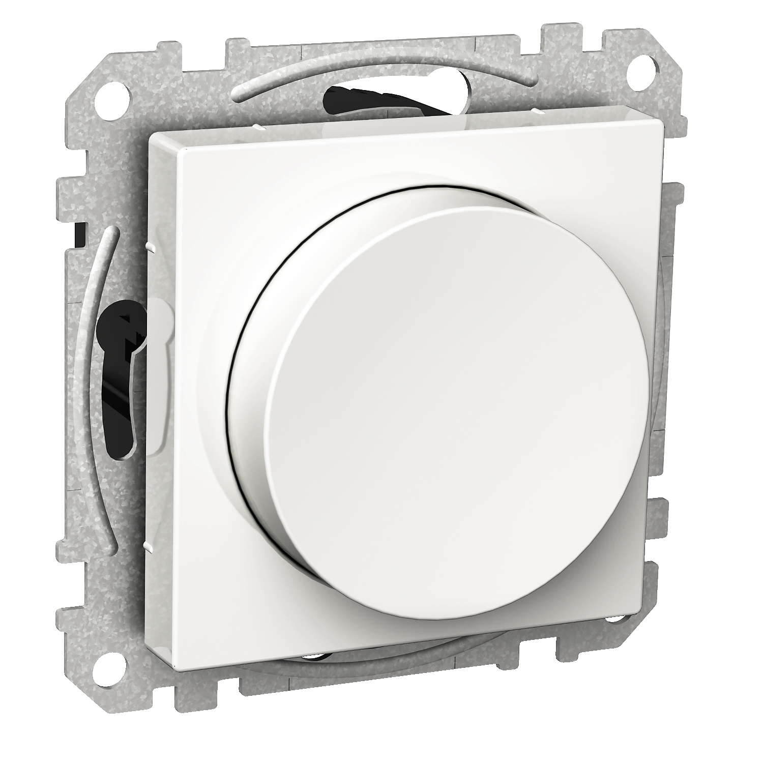 Universal LED Dimmer 4-400W mit Zentralplatte Exxact weiss. Der Universal-Dimmer erkennt automatisch die angeschlossene Last. Keine Mischlasten anschließen. Mit Druck-Wechselschalter. Mit Krallen- und Schraubbefestigung. Mit Schraubklemmen. Nennspannung: AC 230 V~, 50 Hz. Schaltleistung:. LED Lampen: 4-200 VA (RC-Modus). 4-40 VA (RL-LED-Modus). Glühlampen: 4-400 W. Halogenlampen: 4 bis 400 W (230 V). 4 bis 400 VA (NV mit dimmbarem gewickeltem Trafo). 4bis 400 VA (NV mit dimmbarem elektronischem Trafo). Neutralleiter: nicht erforderlich. Anschlussklemmen: Schraubklemmen für max. 2,5 mm2. Absicherung: 16 A-Leitungsschutzschalter. Eigenschaften: -kurzschlussfest. überlastfest. überhitzungsfest. Softstart. automatische Lasterkennung. Min. / Max. Begrenzung einstellbar. Betriebsart RL-LED-Modus einstellbar. Hinweis: Informationen zum Thema Dimmen von LED Leuchtmitteln erhalten Sie im Internet unter Schneider-Electric Dimmertest. http://schneider-electric.dimmer-test.com.