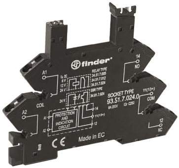 Relaisfassung mit Zugfederklemmen, für DIN-Schiene, Halte- und Demontagehebel, integrierte Anzeige- und EMV-Entstörbeschaltung der Spule, 'sichere Trennung' nach VDE 0106, Teil 101, für Relais der Serie 34.51 oder 34.81, Farbe schwarz, Betriebsnennspannungen: 6-12-24 V DC
