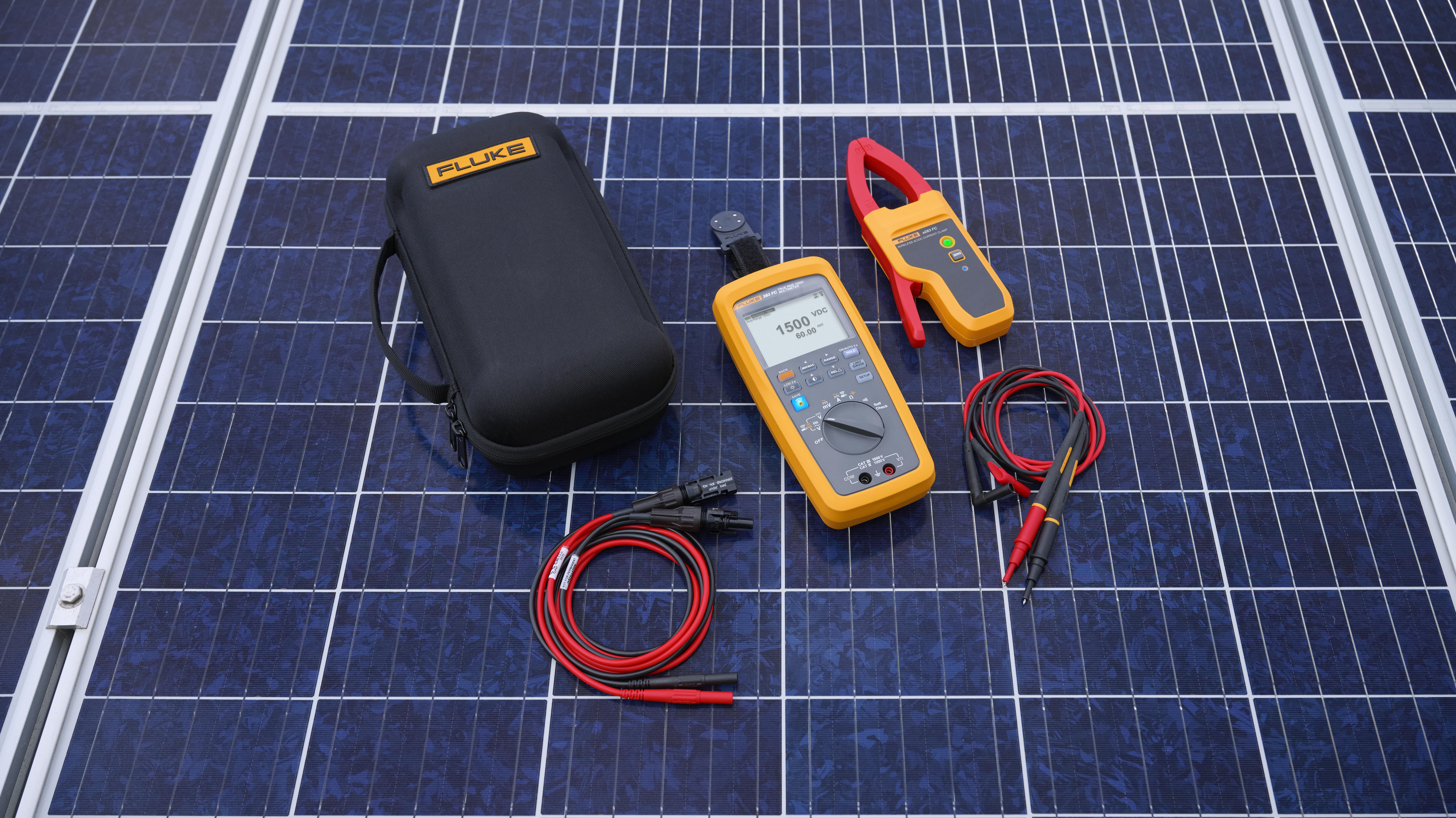 Digitalmultimeter 283 FC mit Messkategorie CAT III 1500 V/CAT IV 1000 V, Wireless-Stromzange a283 FC, Silikon-Messleitungen TL175-HV und Messleitungen Staubli MC4 für CAT III 1500 V