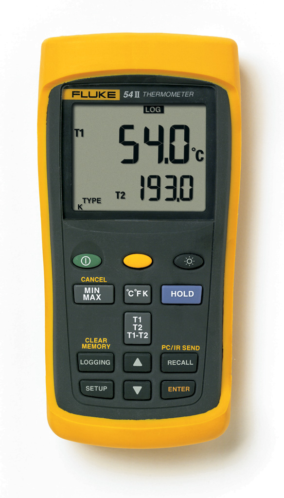 Thermometer mit Aufzeichnungsfunktion, 2-Kanal, für TE Typen E, J, K, N, R, S, T. Bietet eine schnelle Ansprechzeit und die Genauigkeit eines Laborgerätes (0,05% + 03 °C) in einem tragbaren Instrument. Anzeige in °C, °F oder K, Sleep-Modus, außerdem Recall-Funktion, Infrarot-Schnittstelle und Echtzeituhr.