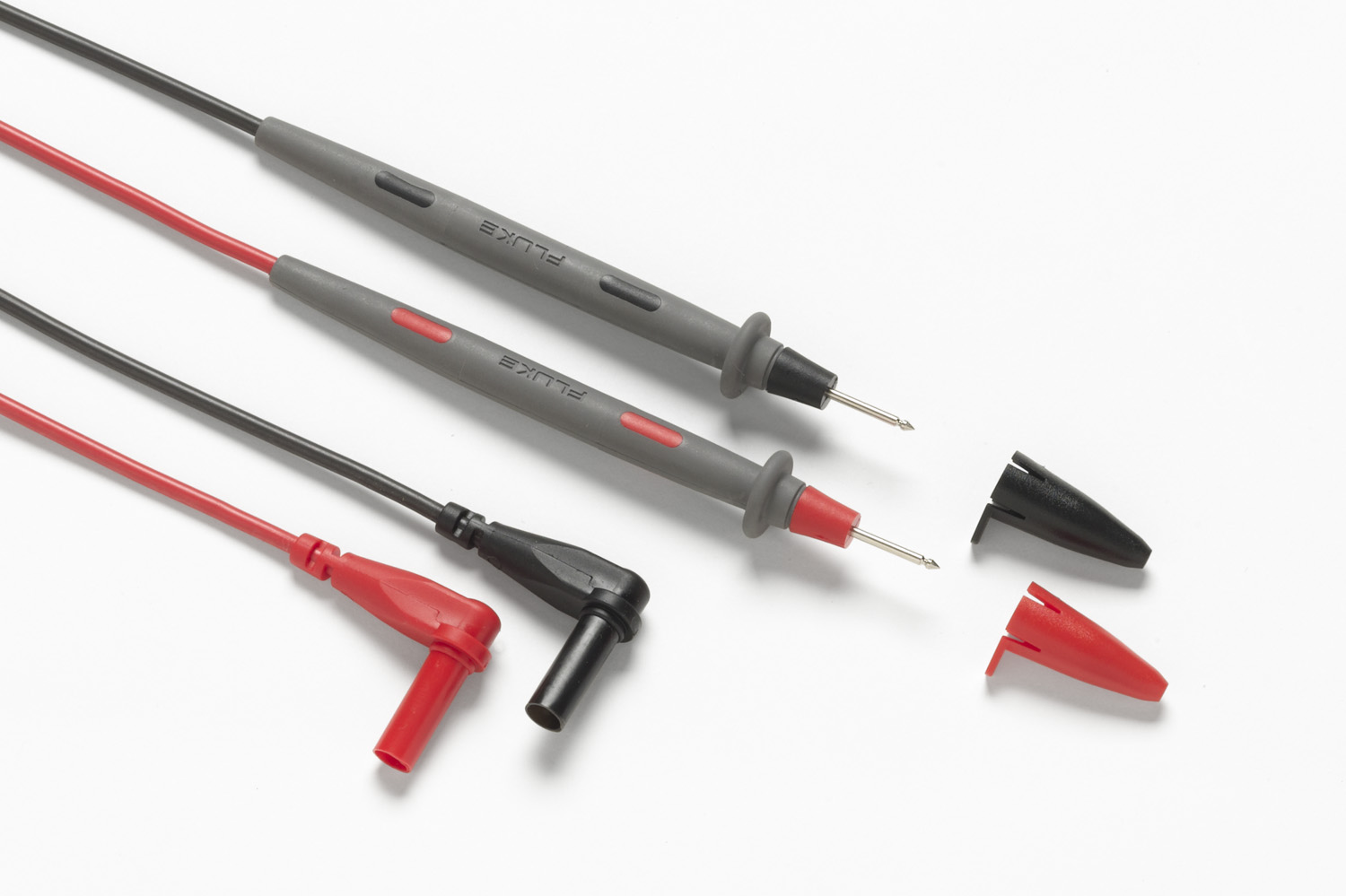 · Ein Paar Silikon-Messleitungen (rot/schwarz) mit rechtwinkligen Anschluss-Steckern und festen Messspitzen (1,5 m lang)
