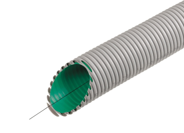 Biegsames Kabelschutzrohr aus PE-HD für Betoninstallation, halogenfrei, in Verbundbauweise, außen gewellt. Farbe grau, mit optimierter grüner Innenwand für den schnellen Kabeleinzug, hohe Druck- und Schlagfestigkeit, mit einseitig aufgesteckter transparenter Kabuflex®-Muffe (sanddicht), Temperaturbeständigkeit -5 °C bis +80 °C. VDE 0605, DIN EN 61386-24, Mindestdruckfestigkeit: 750 N