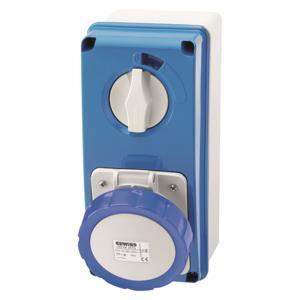 IEC Steckdose im Gehaeuse fuer senkrechte Anordnung mit Schalter und mechanischer Verriegelung. Der Schalter ist verriegelt und kann nur bei eingestecktem Stecker betaetigt werden. Durch ein Vorhaengeschloss kann die IEC Steckdose wahlweise im ein- oder ausgeschalteten Zustand gesichert werden.