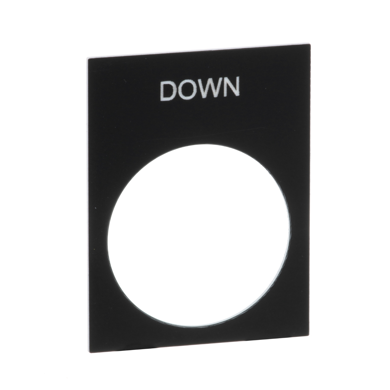Beschriftete Bezeichnungsschild mit 30x40mm, die mit DOWN-Buchstaben gekennzeichnet ist. Es ist ein Zubehör der Baureihe Harmony XAC Hängetaster für 22-mm-Kunststoff-Signaleinheiten mit Durchmesser.