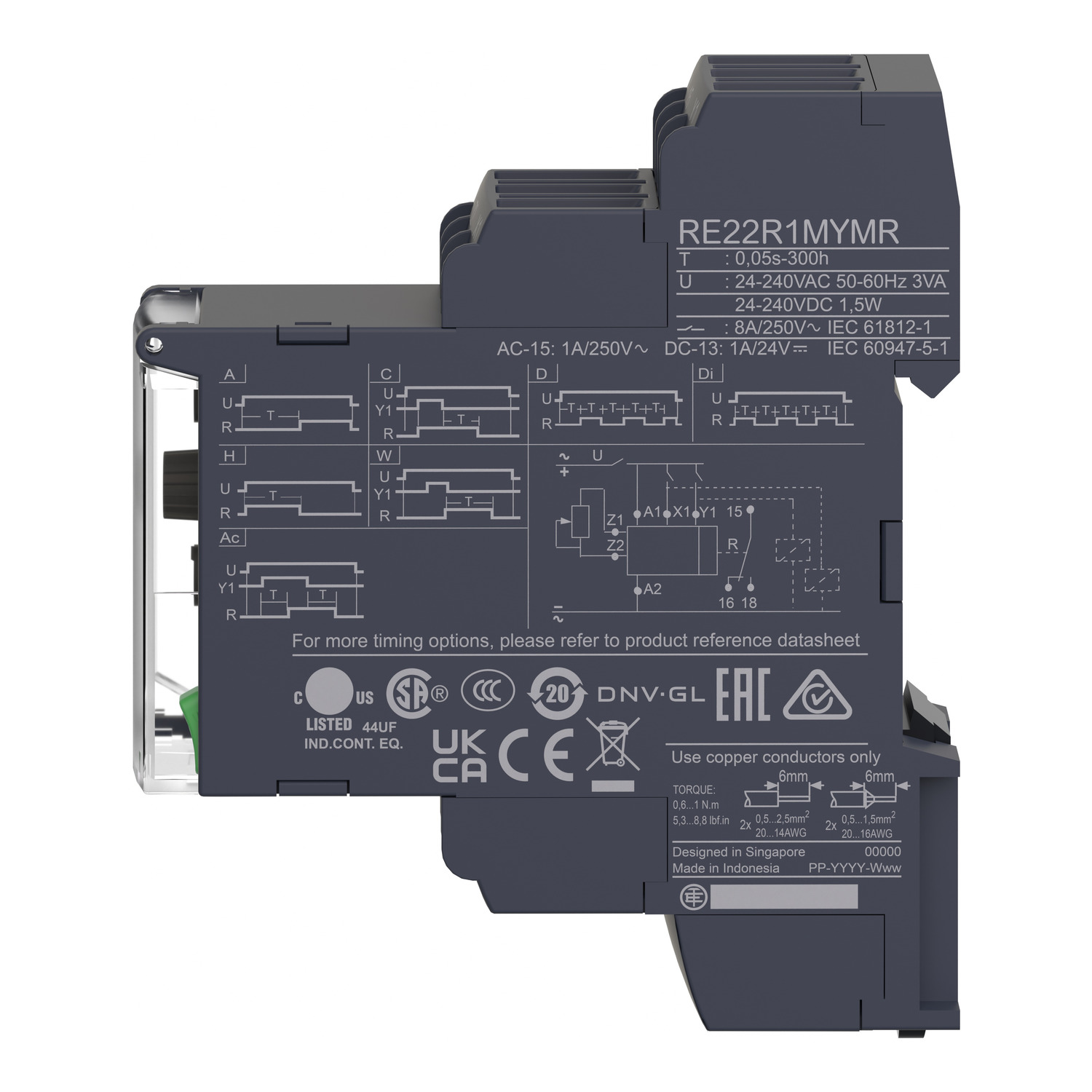 Harmony Time. Elektronisches Multifunktions-Zeitrelais zur Steuerung von Automatisierungsanwendungen in Baubreite 22,5 mm zur Montage auf der Hutschiene. Es verfügt über 18 Zeitfunktionen. Der Zeitbereich umfasst 0,05 s - 300 h. Am Ausgang schaltet ein Relaiswechsler, der bis zu 8 A belastbar ist. Die Einstellungen erfolgen über Bedienelement in der Front, die unter einer Klarsichtabdeckung gegen Veränderungen geschützt werden können. Mit einem beleuchteten Skalenpfeil läßt sich die Einstellung der Potentiometer sehr deutlich auch aus der Entfernung erkennen. Der frontseitige Diagnoseschalter ermöglicht insbesondere bei langen Zeitfunktionen das Einschalten des Ausgangsrelais zum Test der Gesamtanwendung. Mit dem Schließen der Klarsichtabdeckung wird der Diagnoseschalter automatisch zurückgesetzt. LED-Anzeigen informieren über den Zustand. Das Weitspannungsnetzteil (24-240 VAC/DC) ermöglicht einen universellen Einsatz. Der Leitungsanschluss erfolgt über Schraubklemmen.
